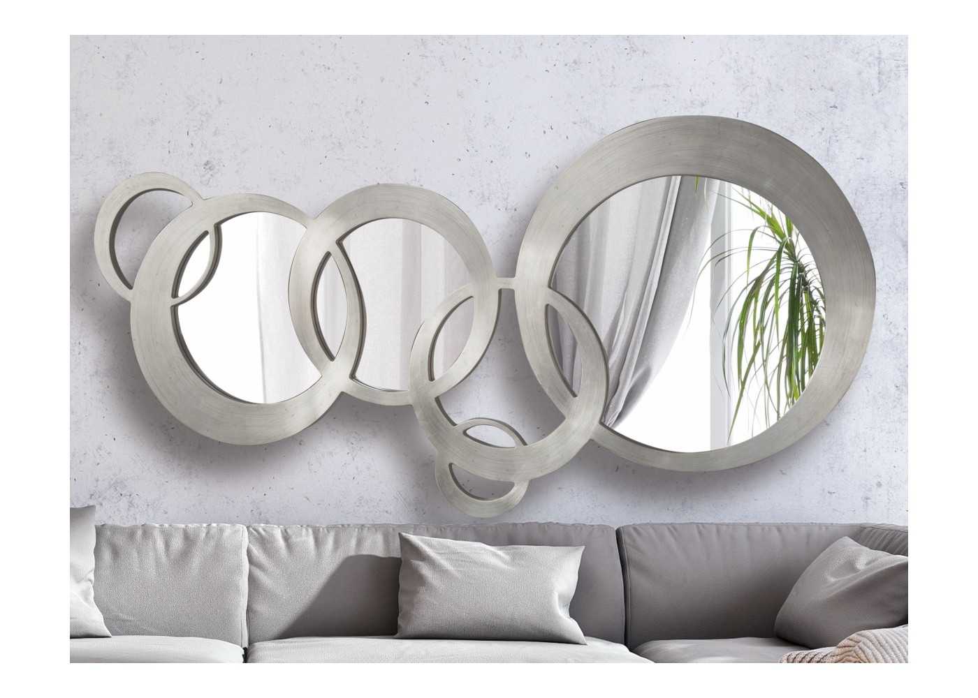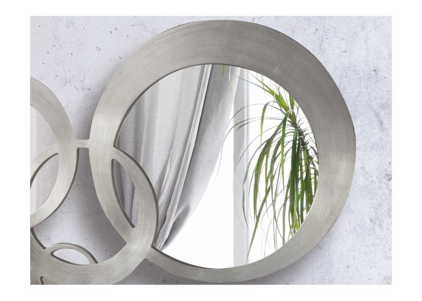 Miroir original et décoratif composé de cercles imbriqués de différentes tailles, avec des cadres finis à la feuille d'argent.