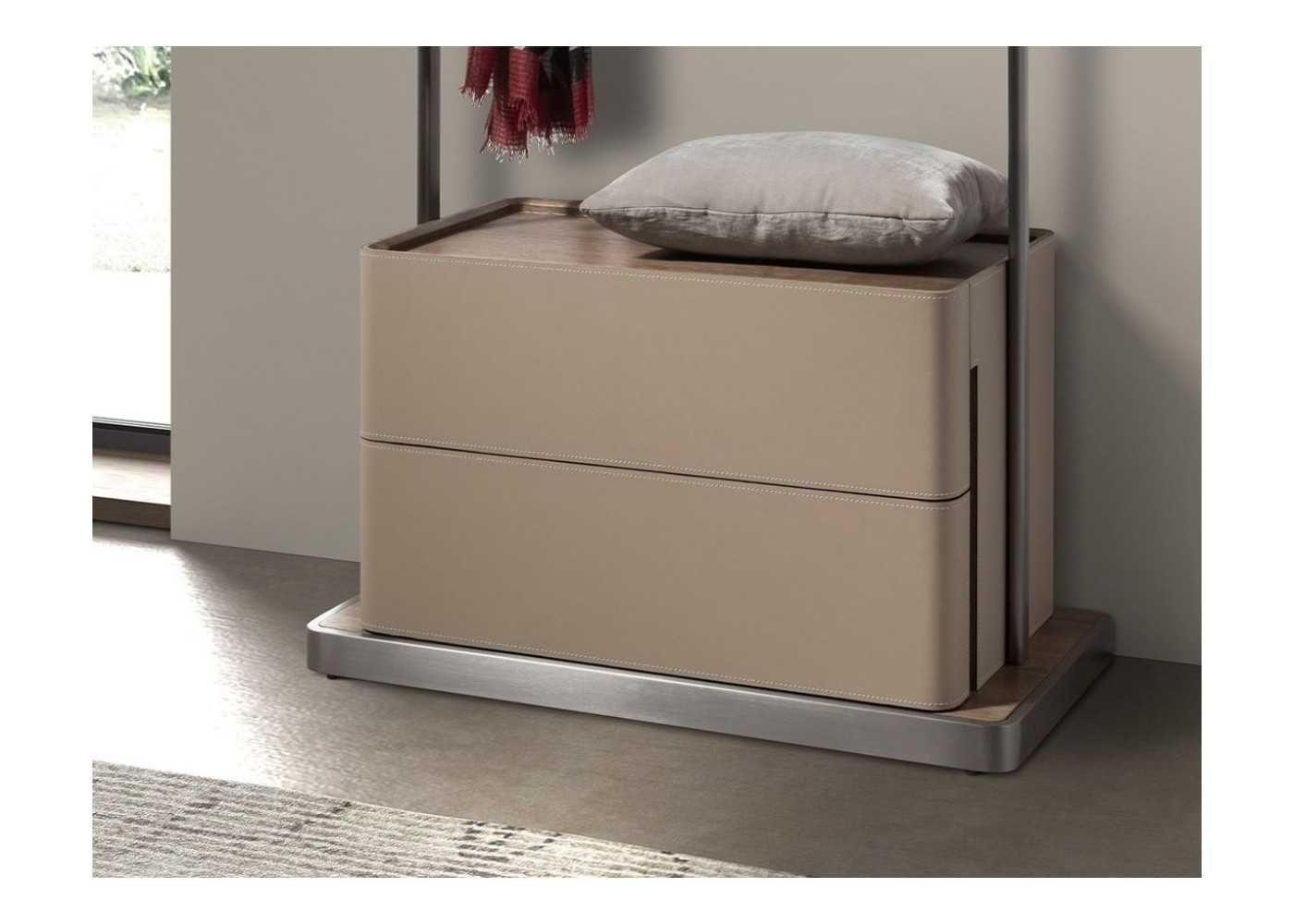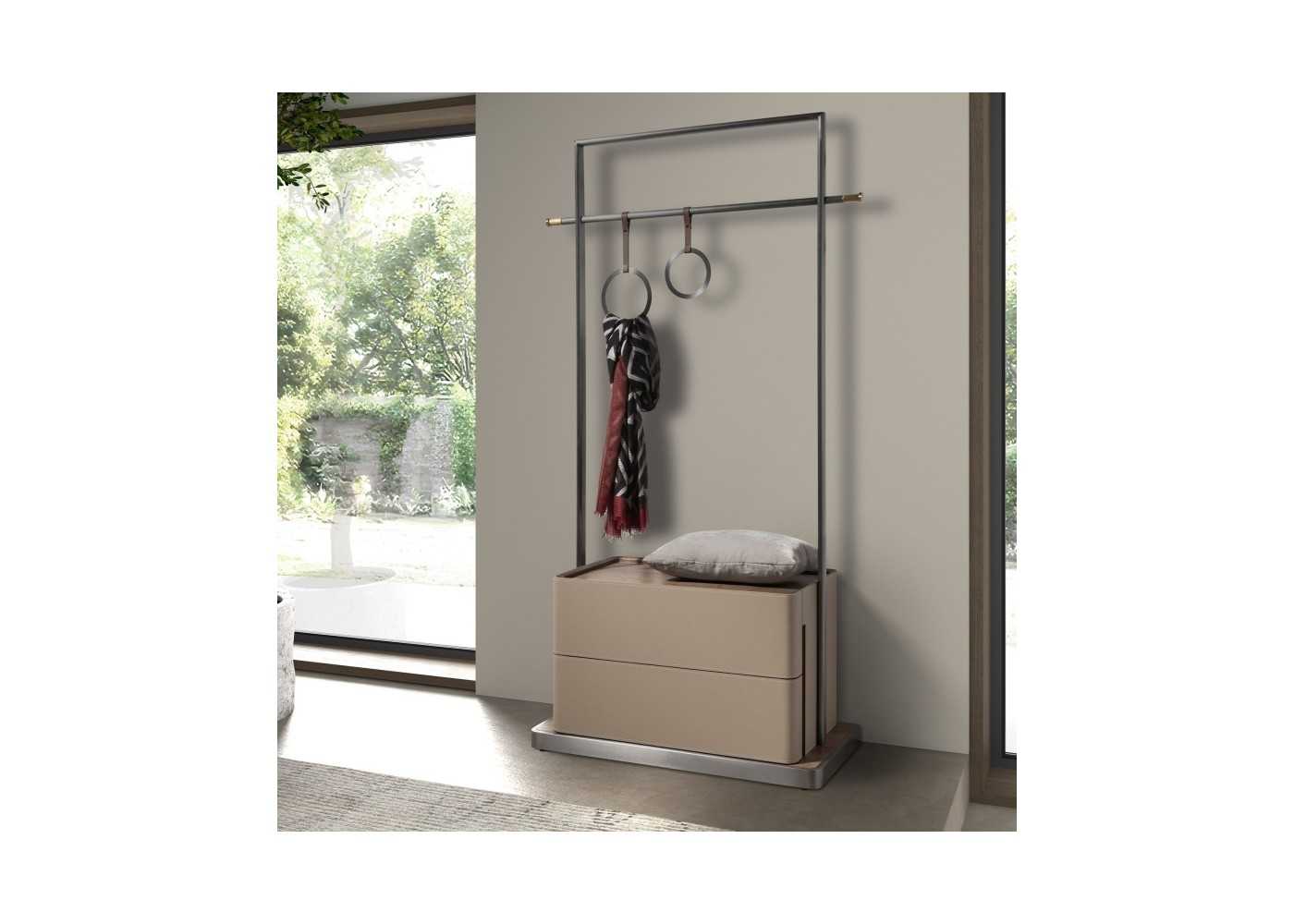 Porte-manteau pratique avec structure en acier inoxydable poli et caisson en frêne plaqué noyer avec deux tiroirs et façades tapissé de cuir véritable couleur vison.
