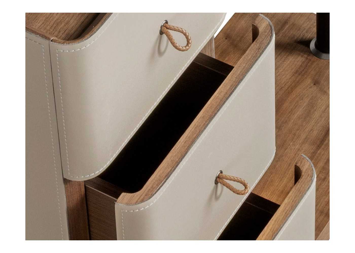 Grand espace de rangement grâce à un bloc 4 tiroirs avec système d'ouverture par tirette en cuir véritable, fermeture amortie et glissières télescopiques.