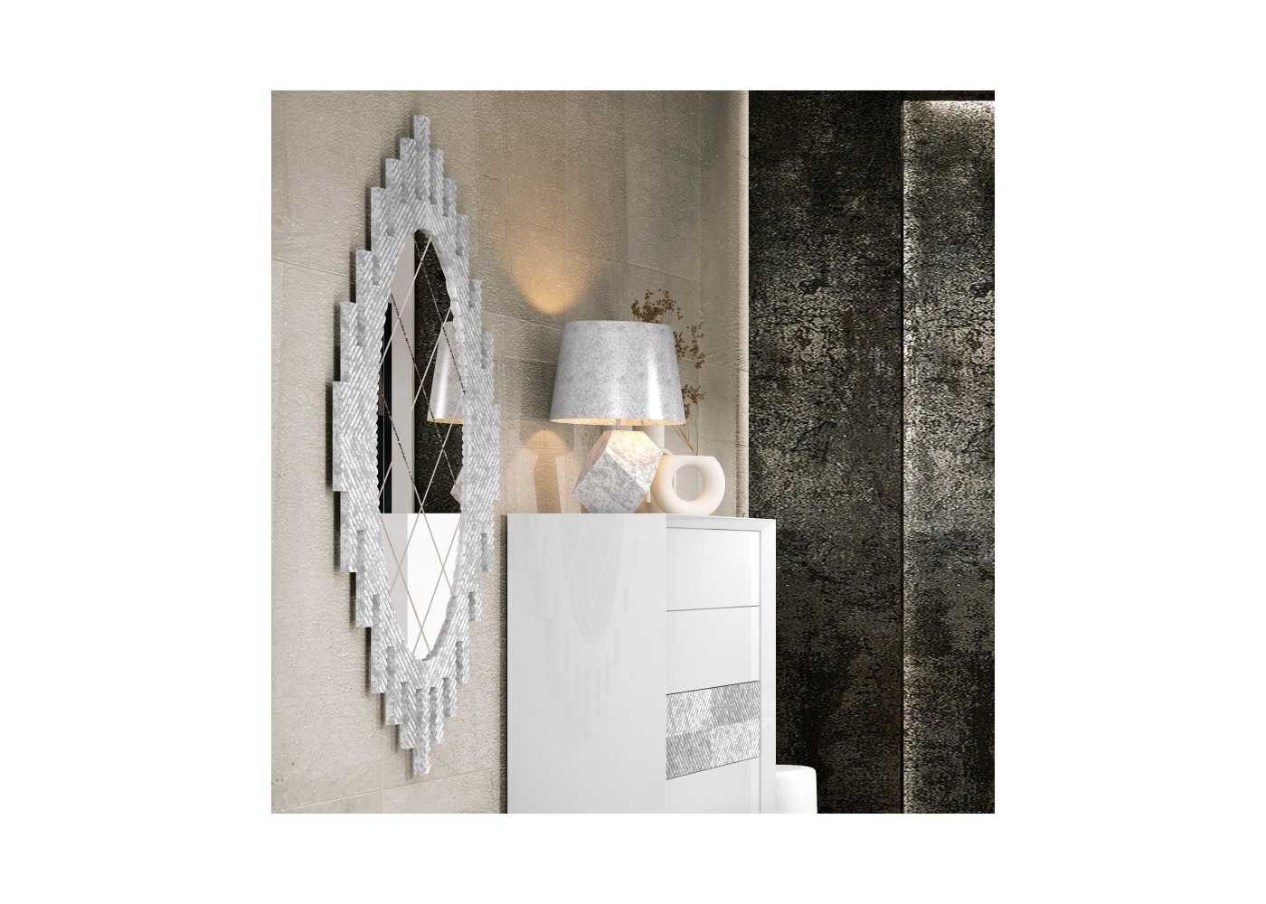 Miroir décoratif original de forme ovale avec un cadre original au motif losangé, finition marbrée argentée et miroir losangé biseauté.
