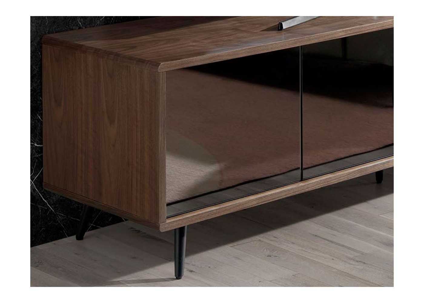Meuble TV élégant et fonctionnel au design moderne réalisé avec une structure en bois de frêne plaqué en noyer naturel avec une base en acier inoxydable et des pieds peints en époxy noir.