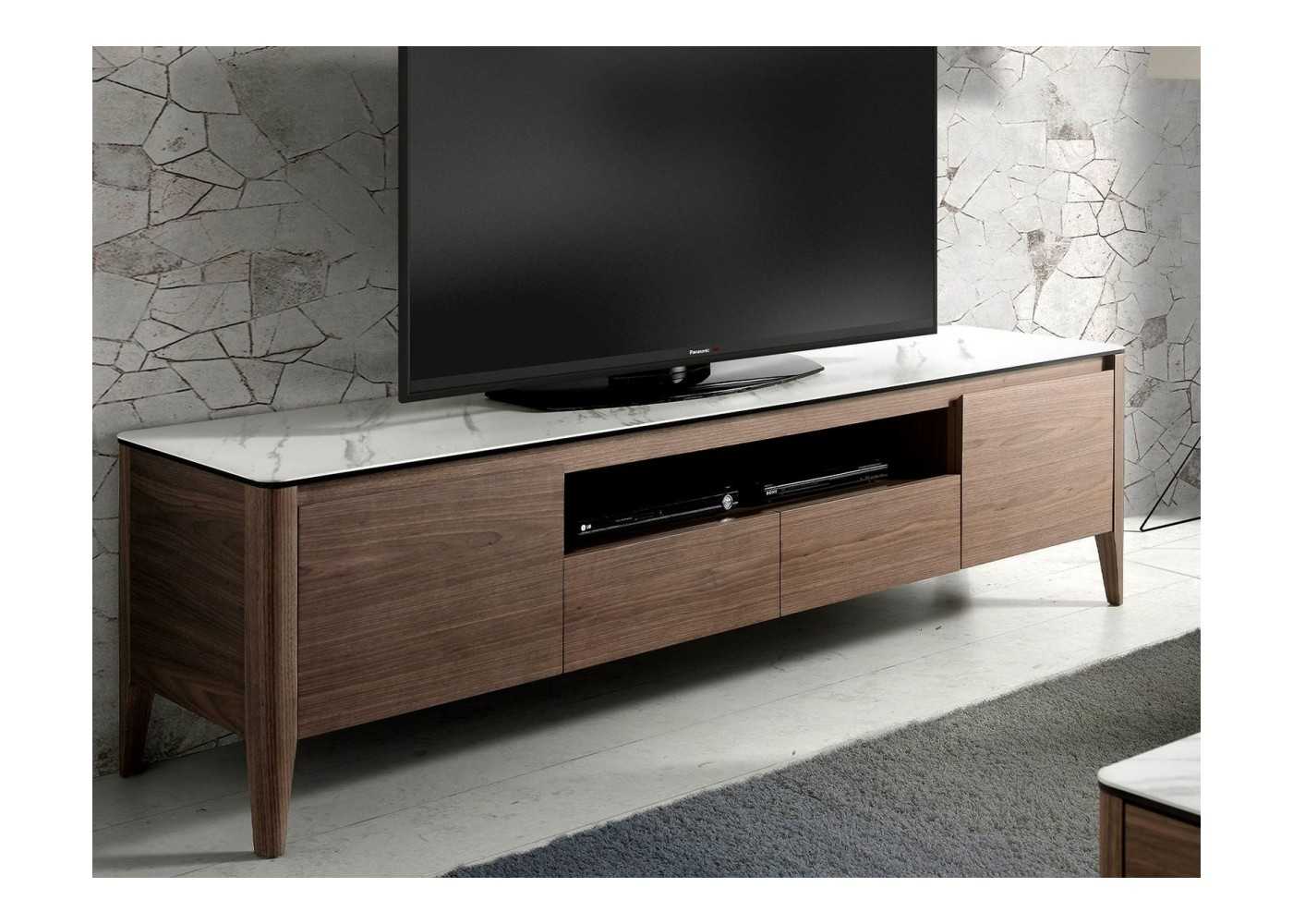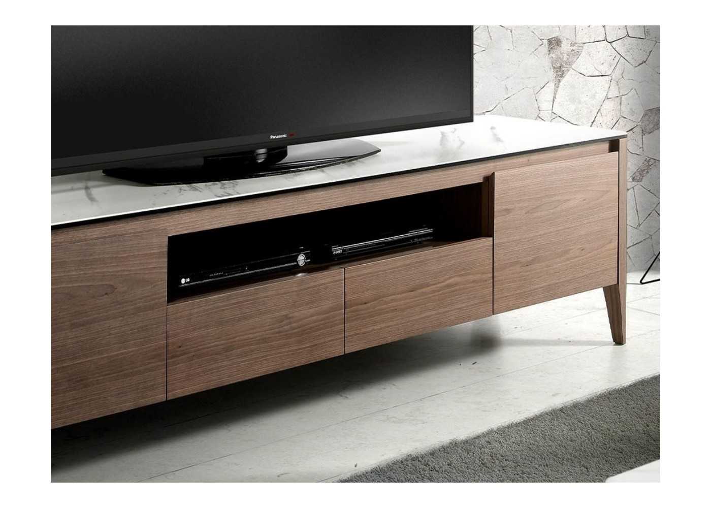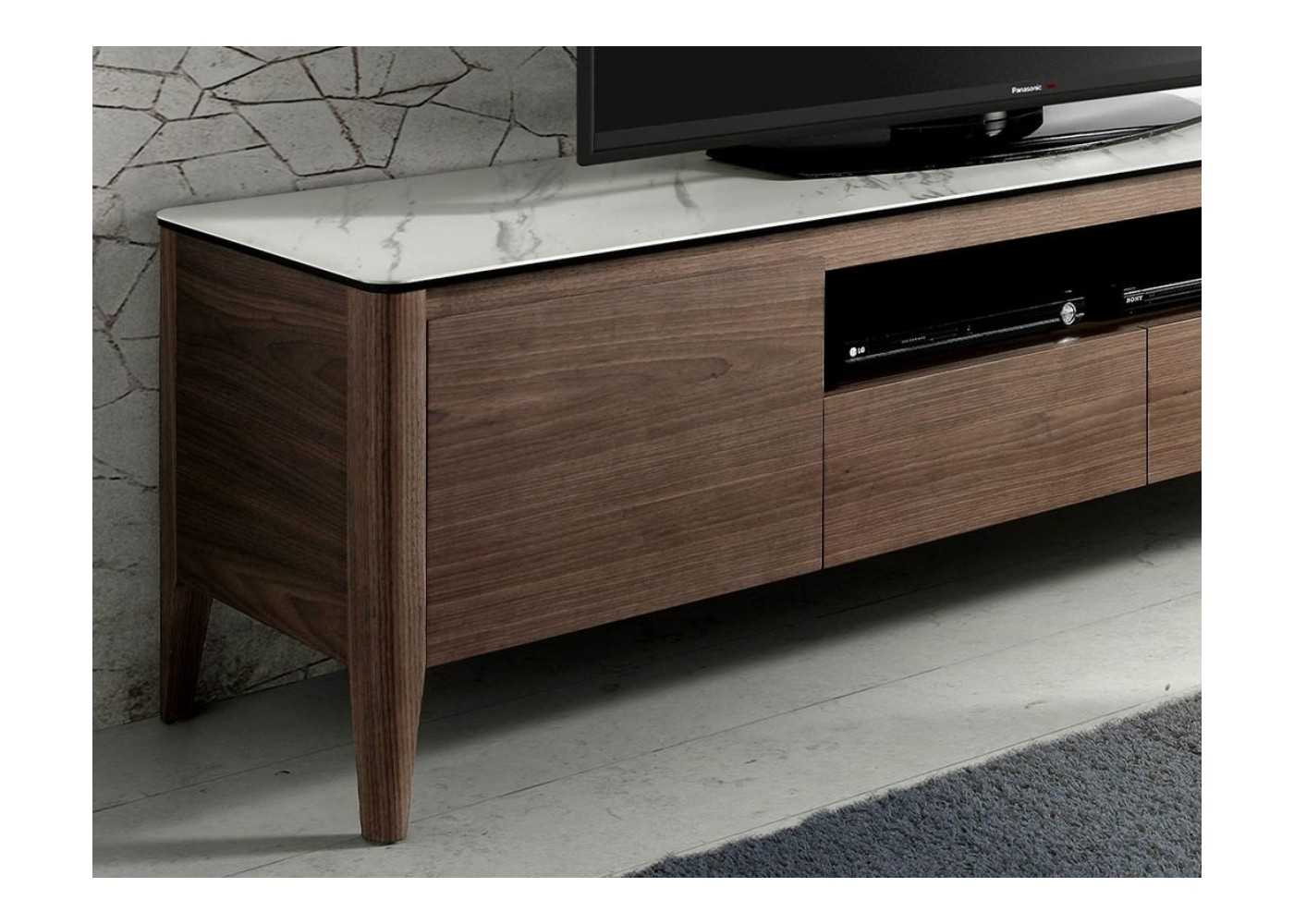 Meuble TV en noyer et plateau en marbre porcelaine - VALENTINO