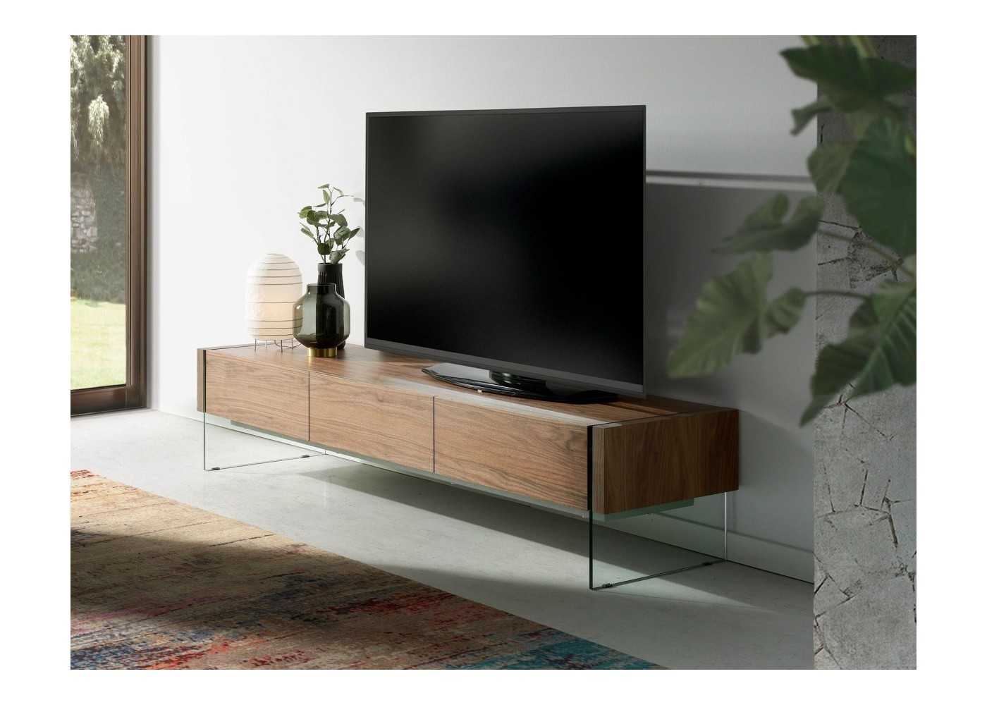 Meuble TV au design moderne avec 3 tiroirs en bois plaqué noyer naturel et pieds en verre trempé.