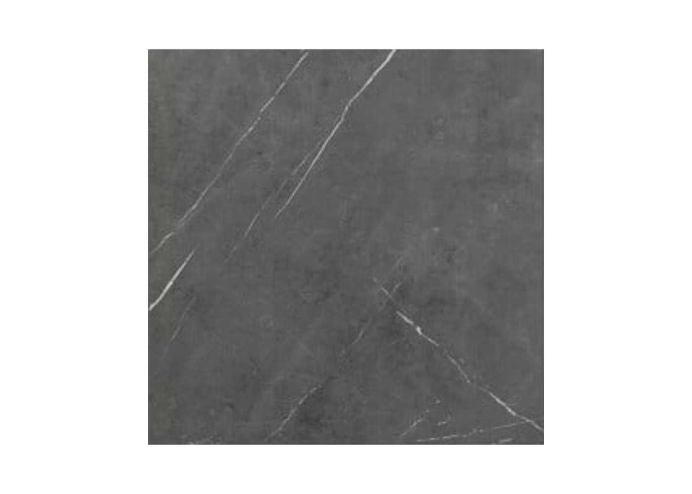 Table de salle à manger originale avec plateau en céramique grise veinée de blanc.