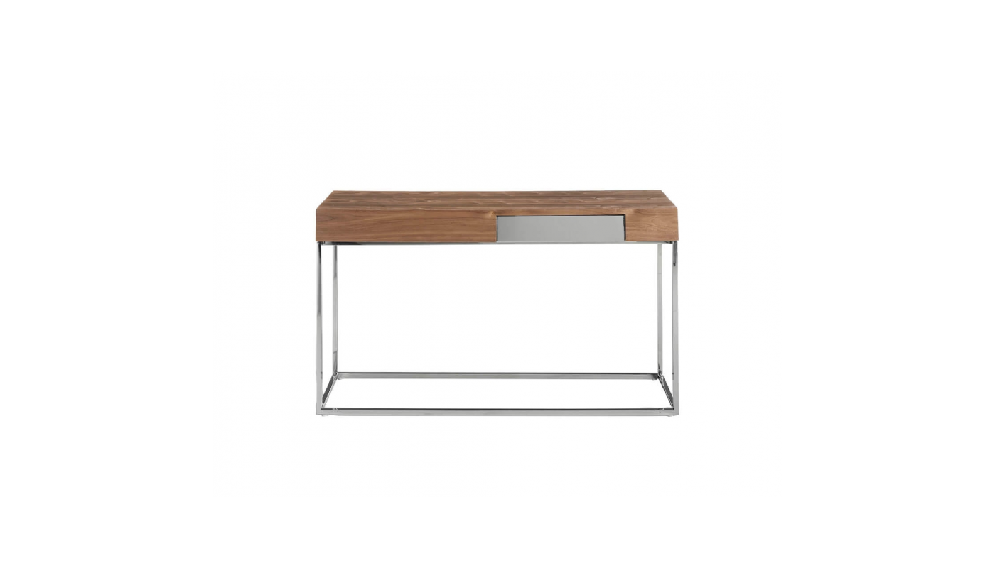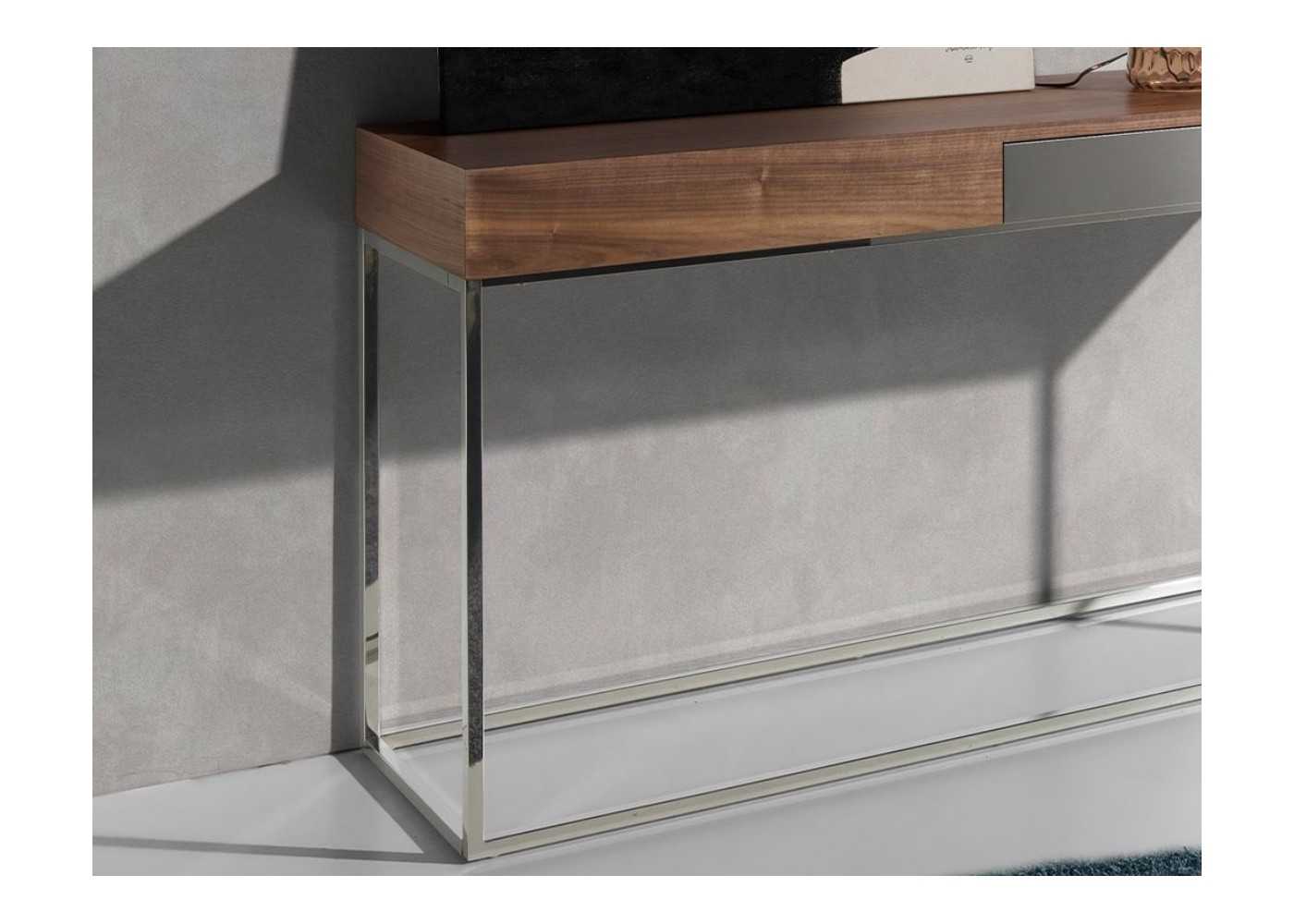 Console rectangulaire en bois massif avec placage en noyer naturel et 1 tiroir. Façade du tiroir et cadre de base en acier inoxydable chromé.