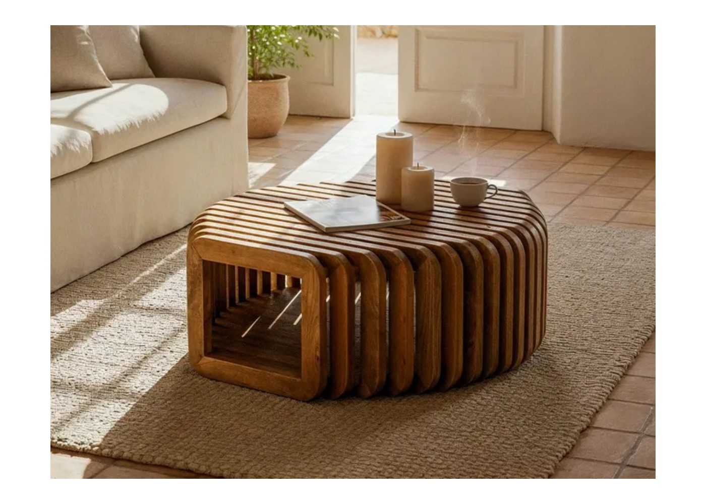 Table basse originale en bois de manguier massif, finition naturelle et design unique.
