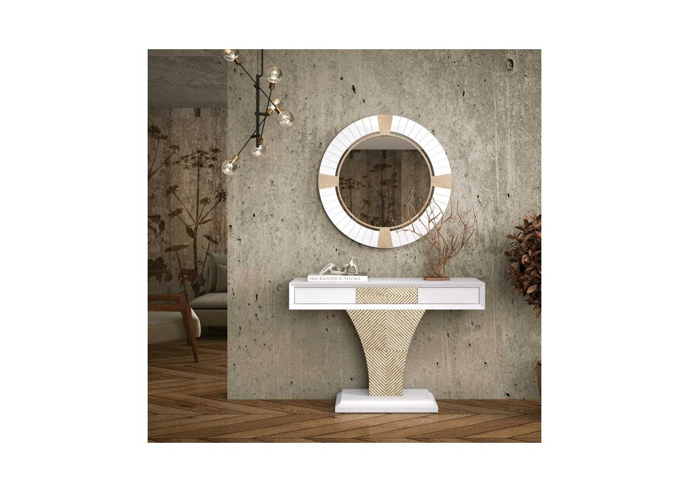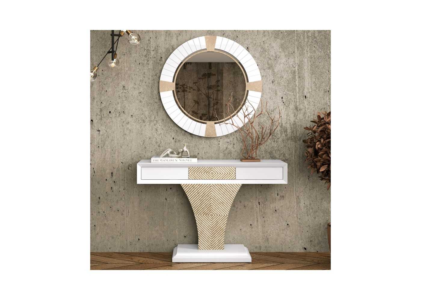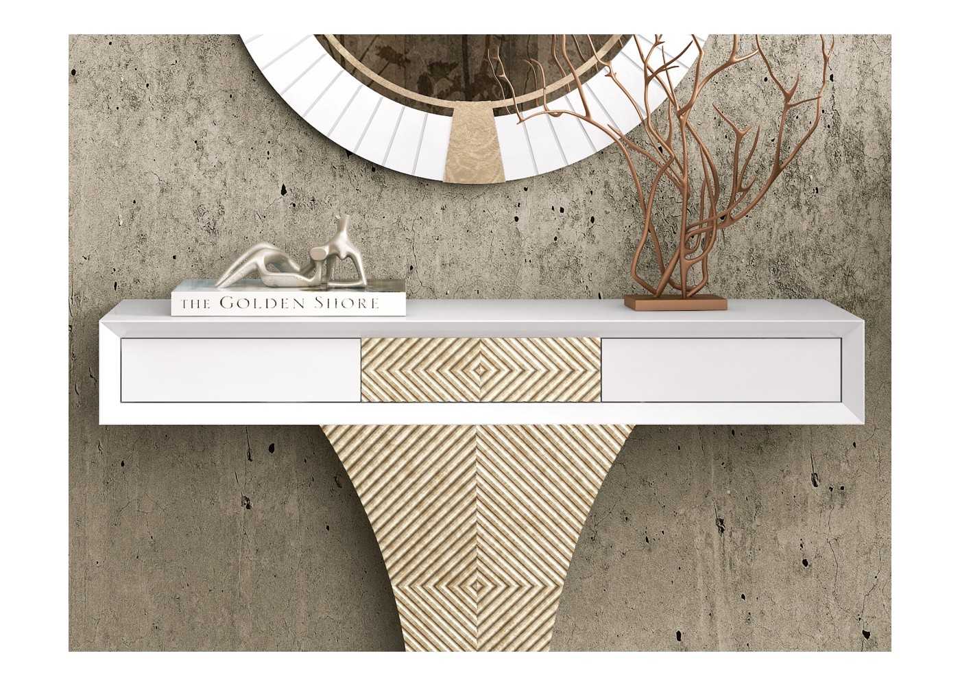 Console d'entrée originale à 3 tiroirs, de design moderne. Laquée avec détails sur la colonne centrale et la façade du tiroir central ornée d'une gravure originale en marbre couleur champagne.