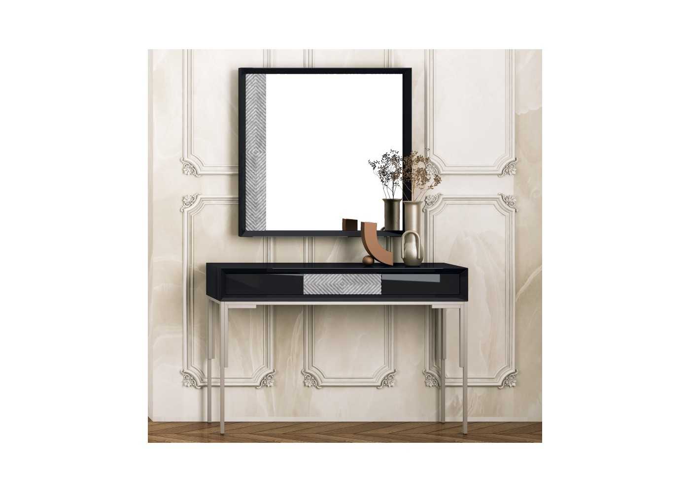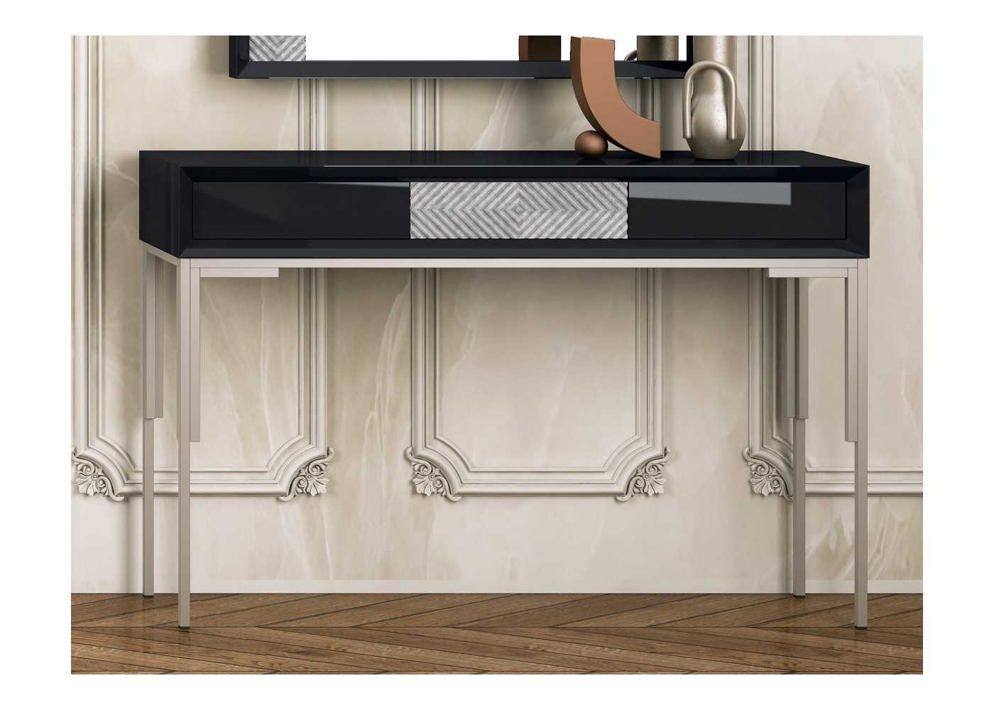 Console d'entrée originale à 2 ou 3 tiroirs, au design moderne. Finition laquée avec une gravure marbrée argentée unique sur la façade du tiroir central. Piètement en acier laqué.