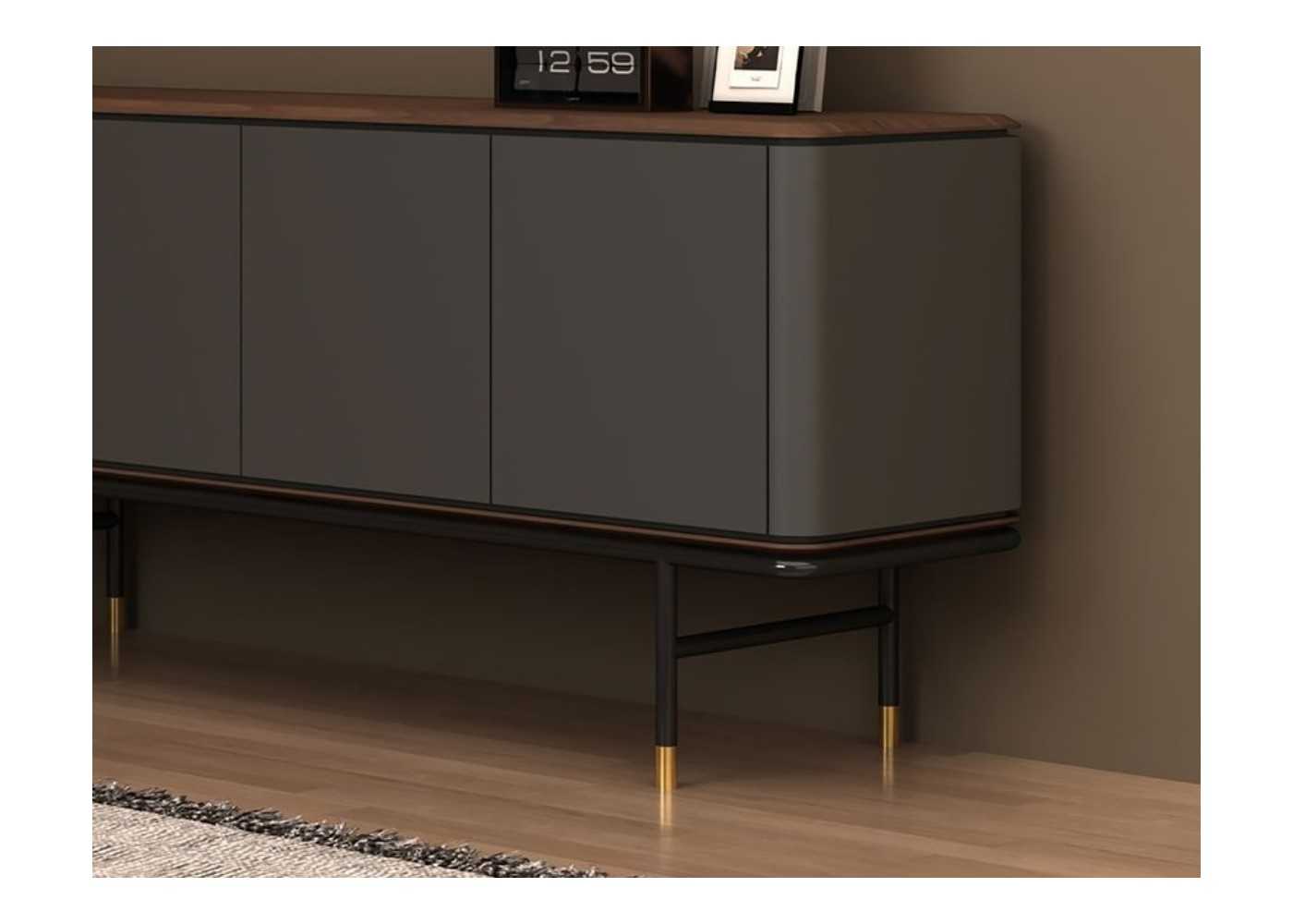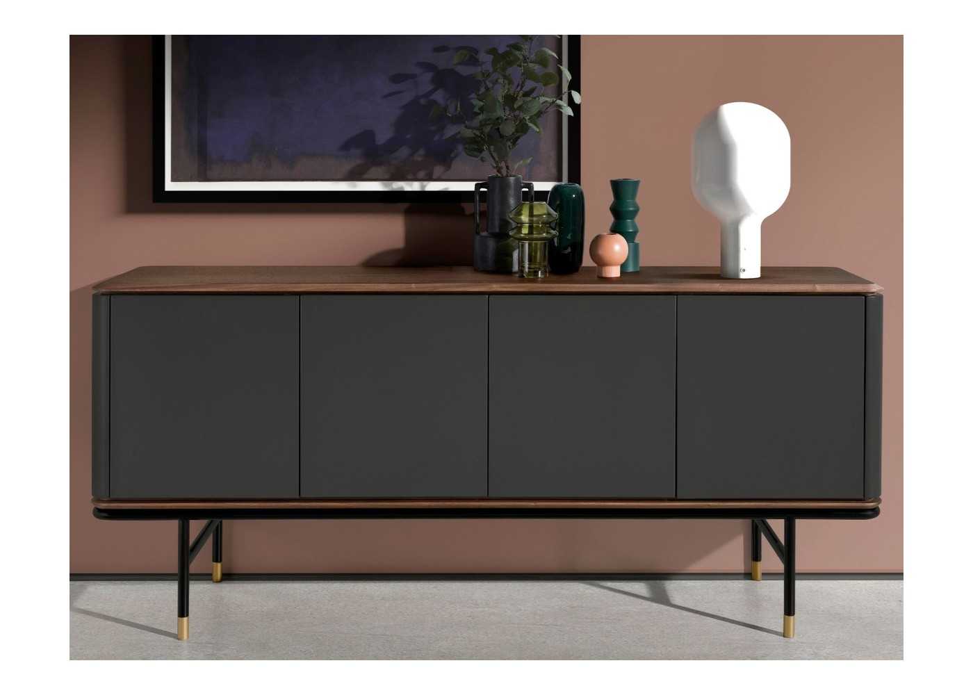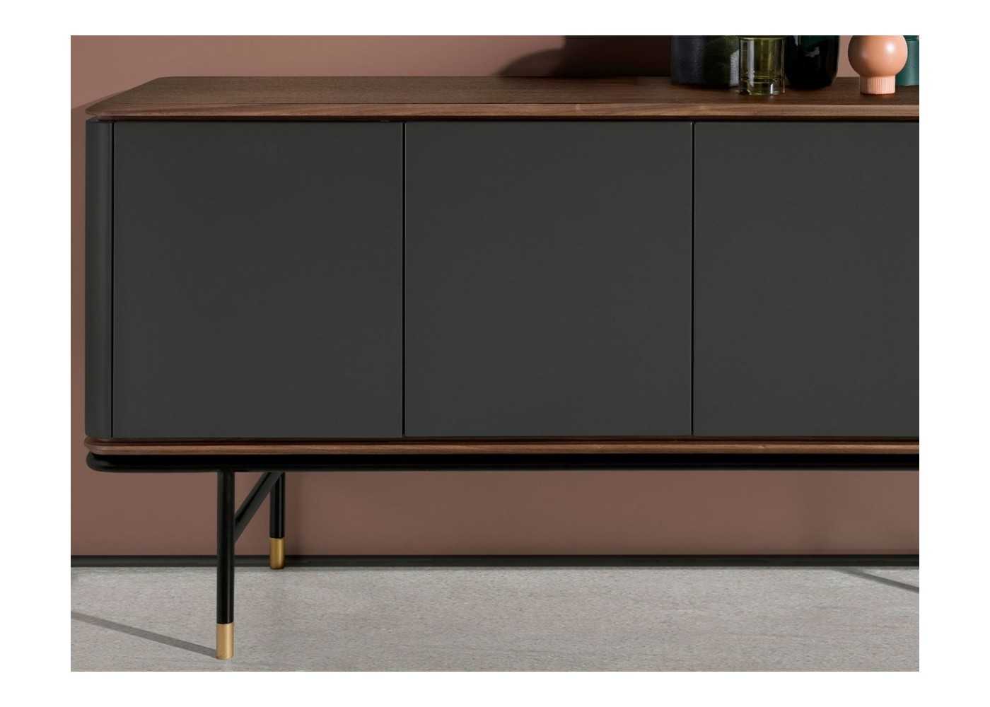 Buffet de design moderne avec plateau et base de porte en bois de noyer, structure centrale et portes laquées, structure de pieds en acier inoxydable noir et détails en acier doré.