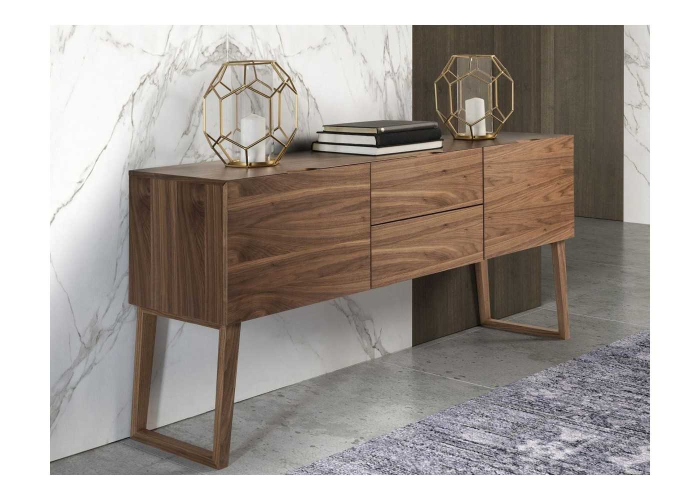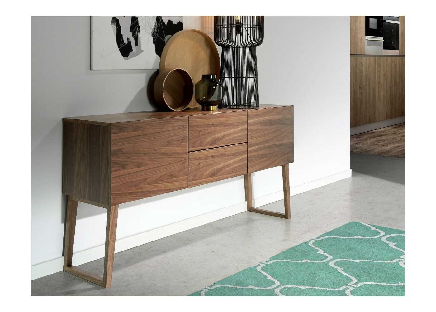 Buffet au design moderne en placage de noyer naturel, avec 2 portes latérales et 2 tiroirs centraux pour le rangement.