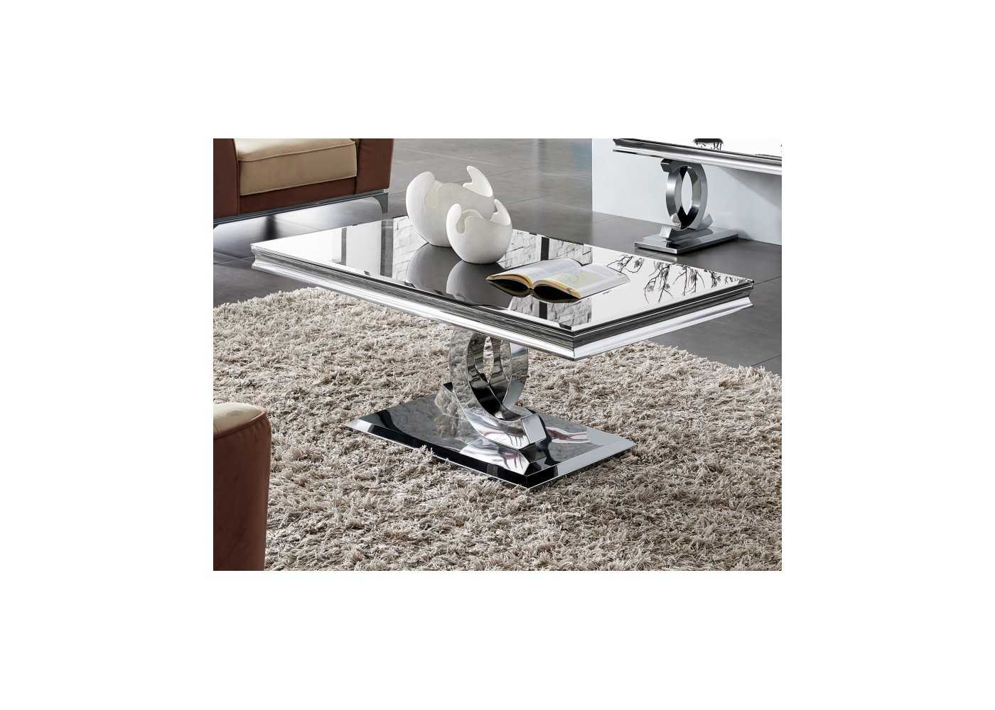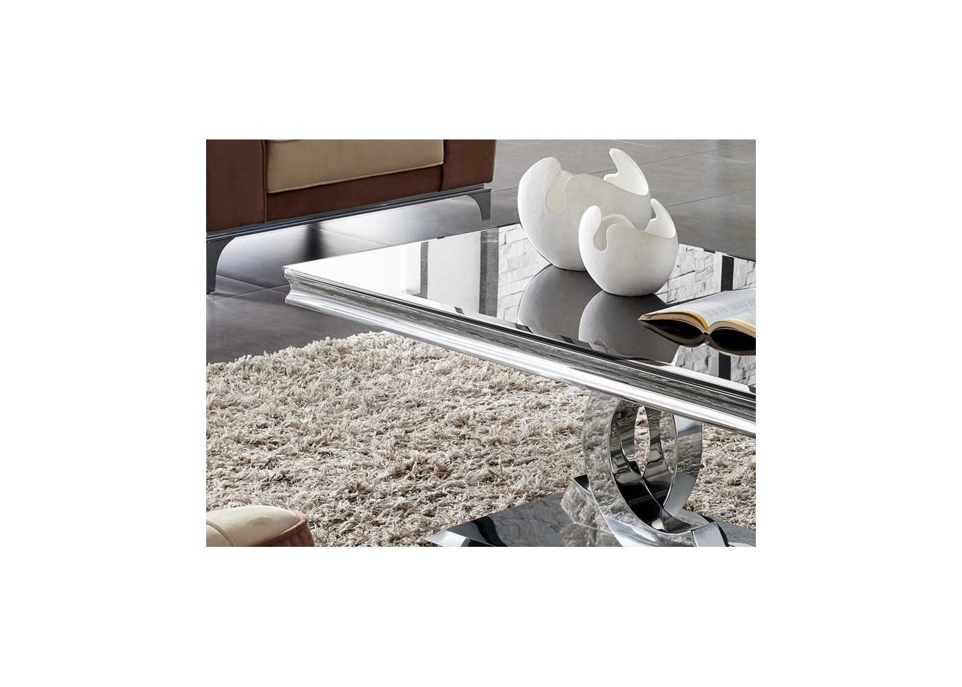 Élégante table basse rectangulaire en acier inoxydable chromé avec un plateau en verre blanc LACOBEL.