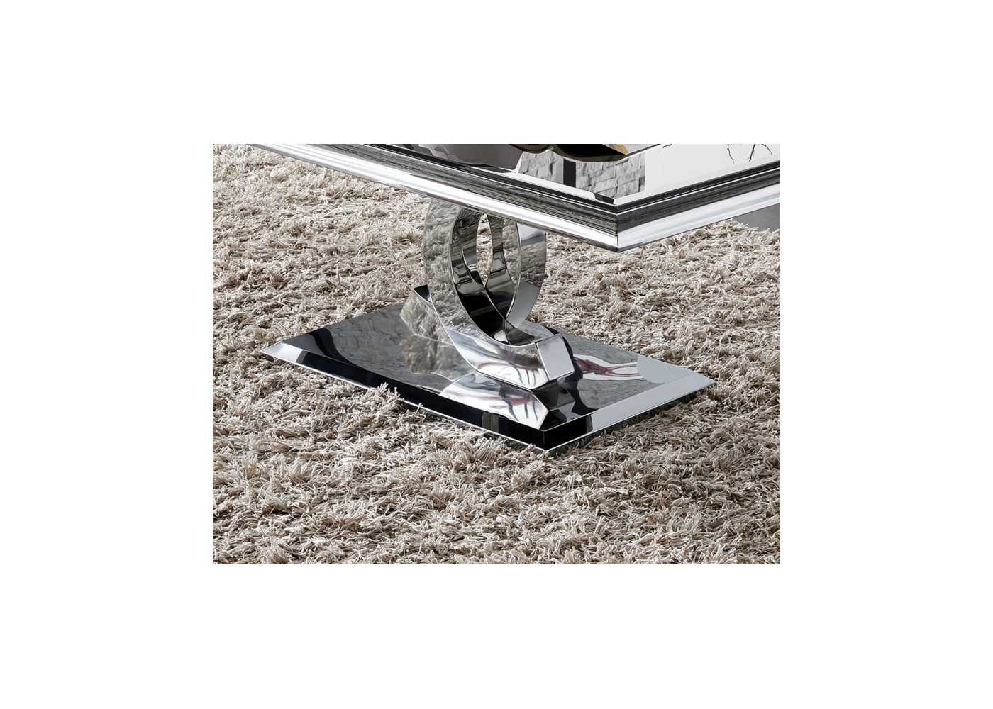 La structure de 6 cm d'épaisseur est en acier inoxydable chromé et poli, et le plateau en verre blanc LACOBEL de 12 mm d'épaisseur présente des bords polis.