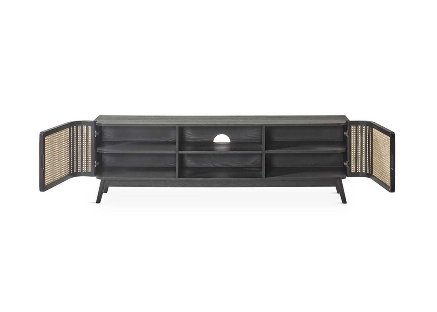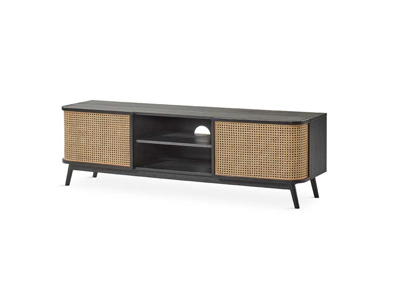 Meuble TV moderne avec deux portes latérales pliantes avec façades à grille radiale, un niche central avec une étagère et un cadre en chêne massif avec une finition teintée noire.