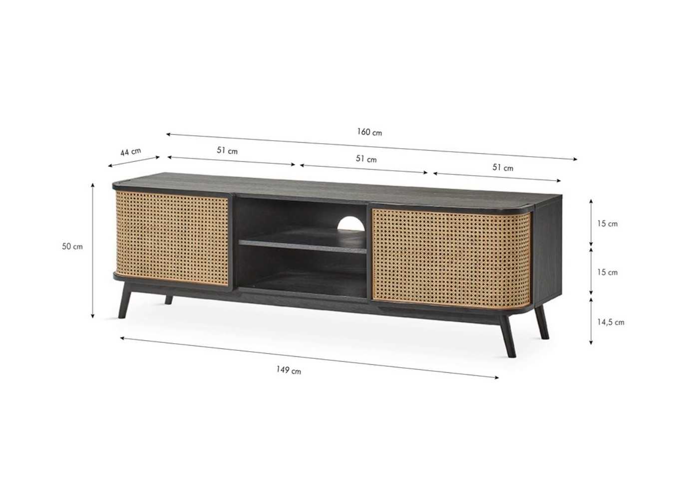 Fabriqué en chêne massif avec finition teintée noire et façades originales en fibre naturelle.