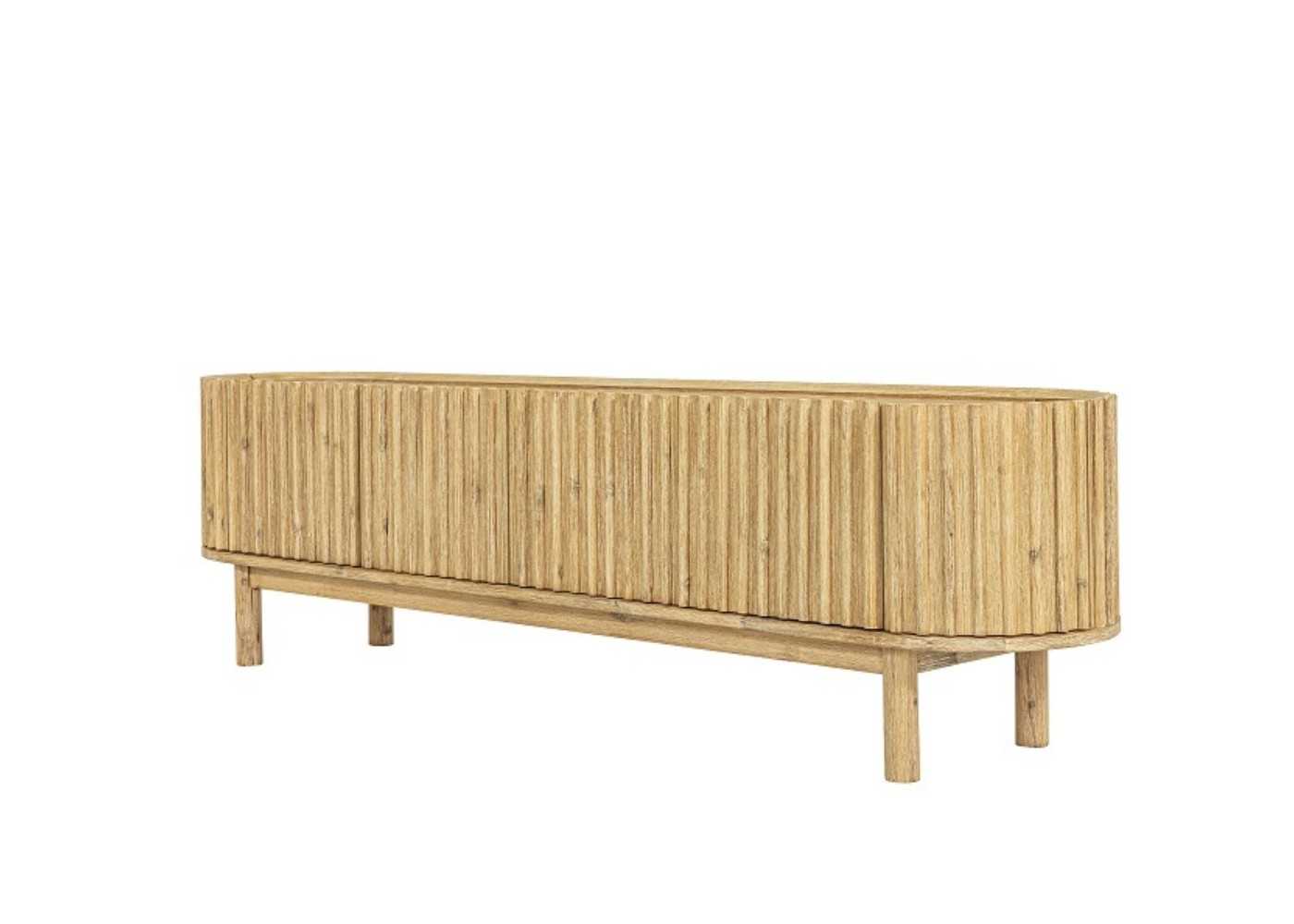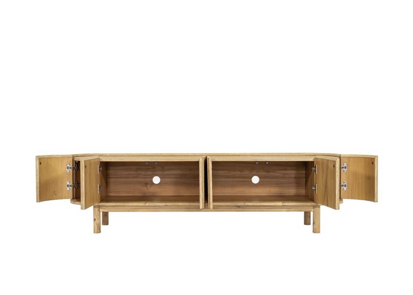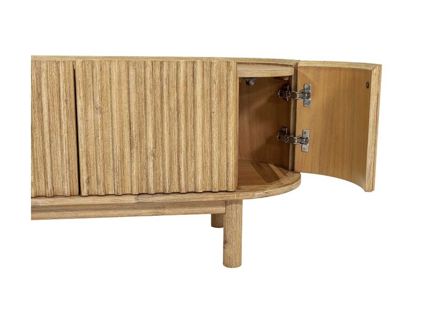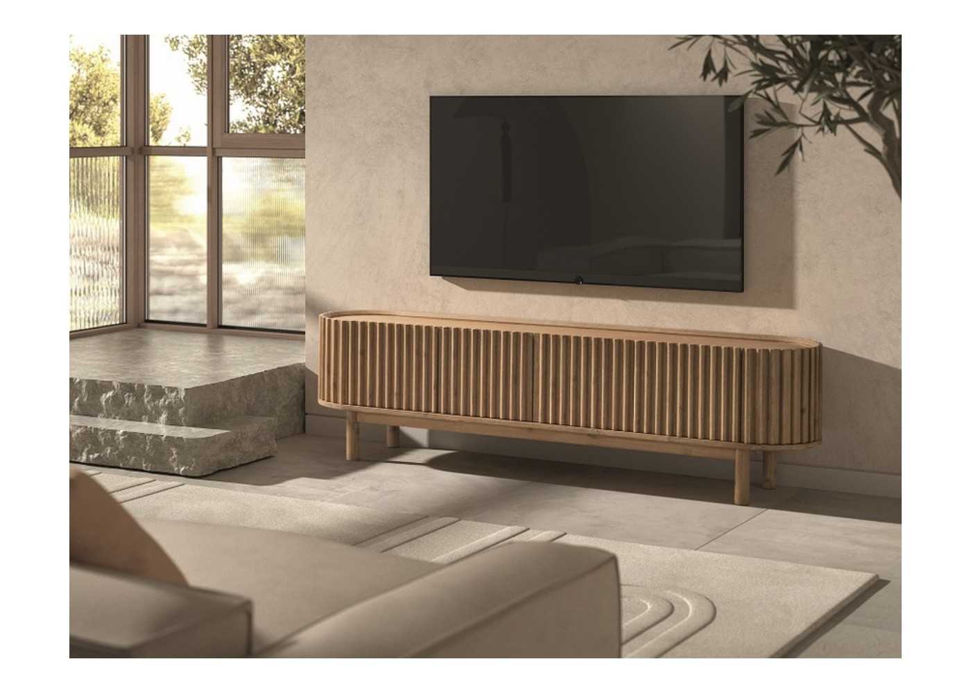 Meuble TV en bois d'acacia massif avec 2 portes centrales et 2 portes latérales arrondies avec façades cannelées.