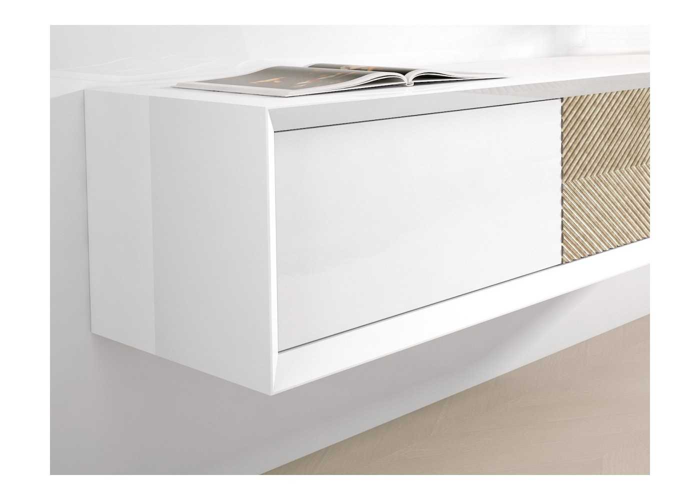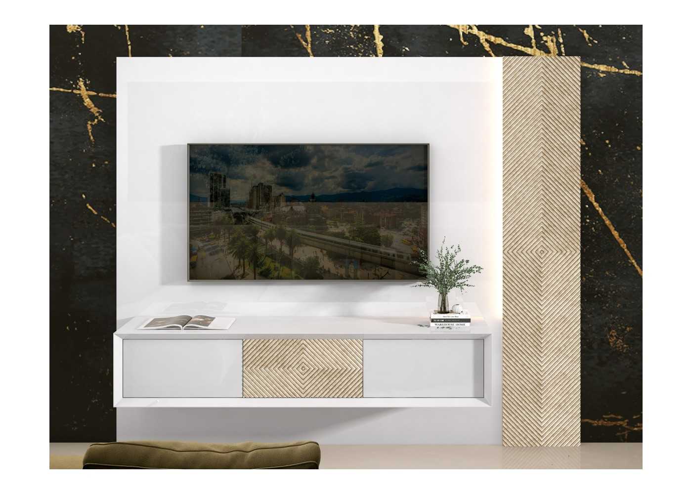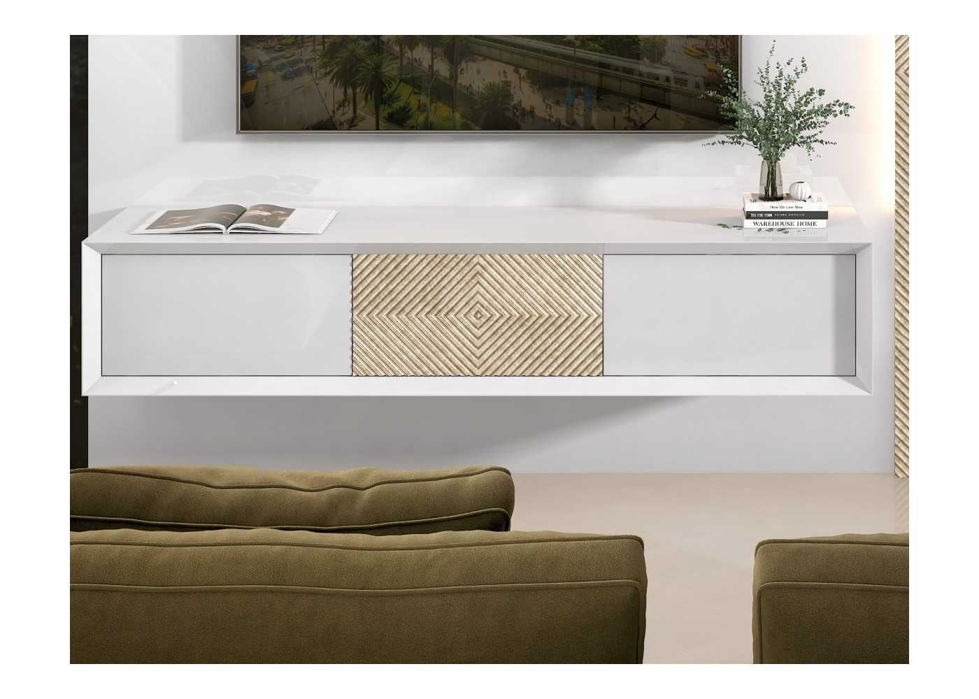 Composition au design moderne, spectaculaire et élégante, composée d'un meuble TV mural à trois tiroirs et d'un panneau arrière laqué orné d'une gravure verticale en losange