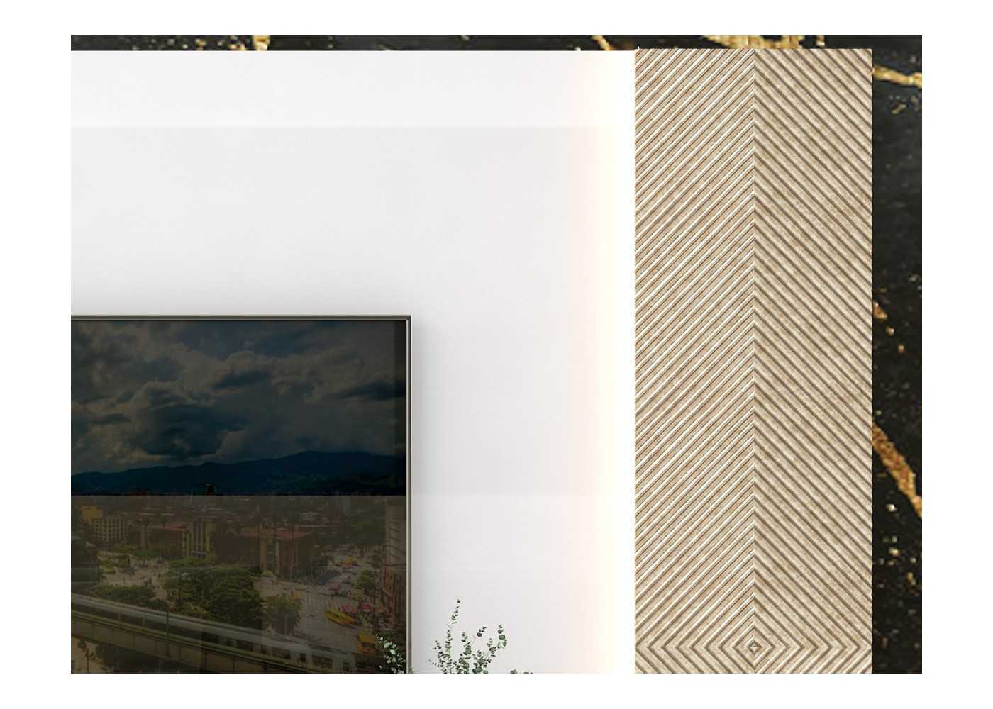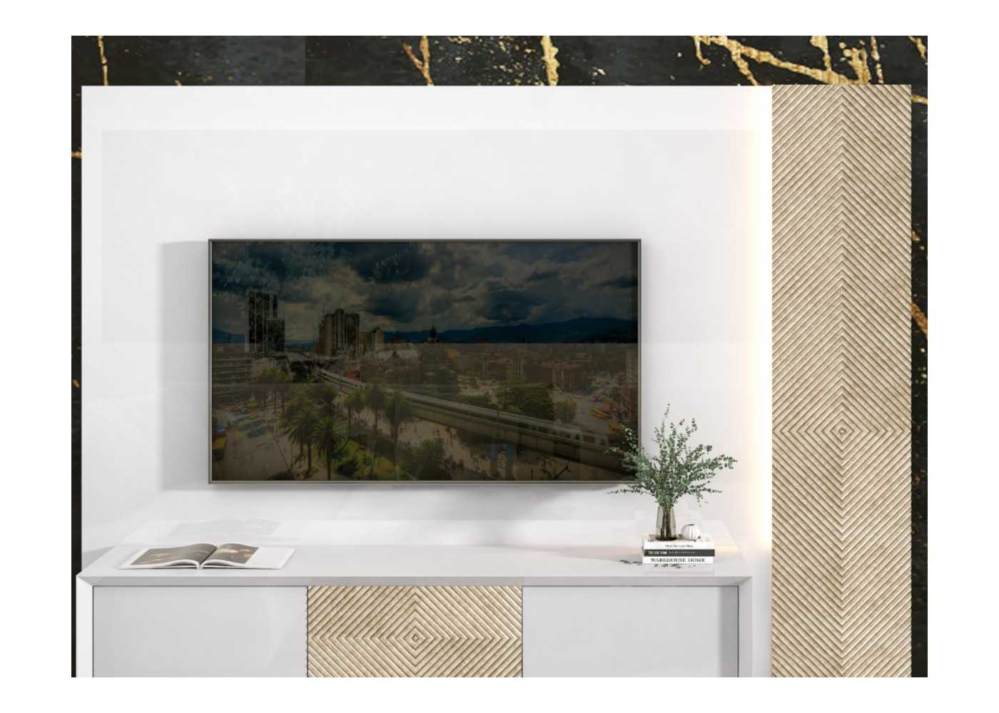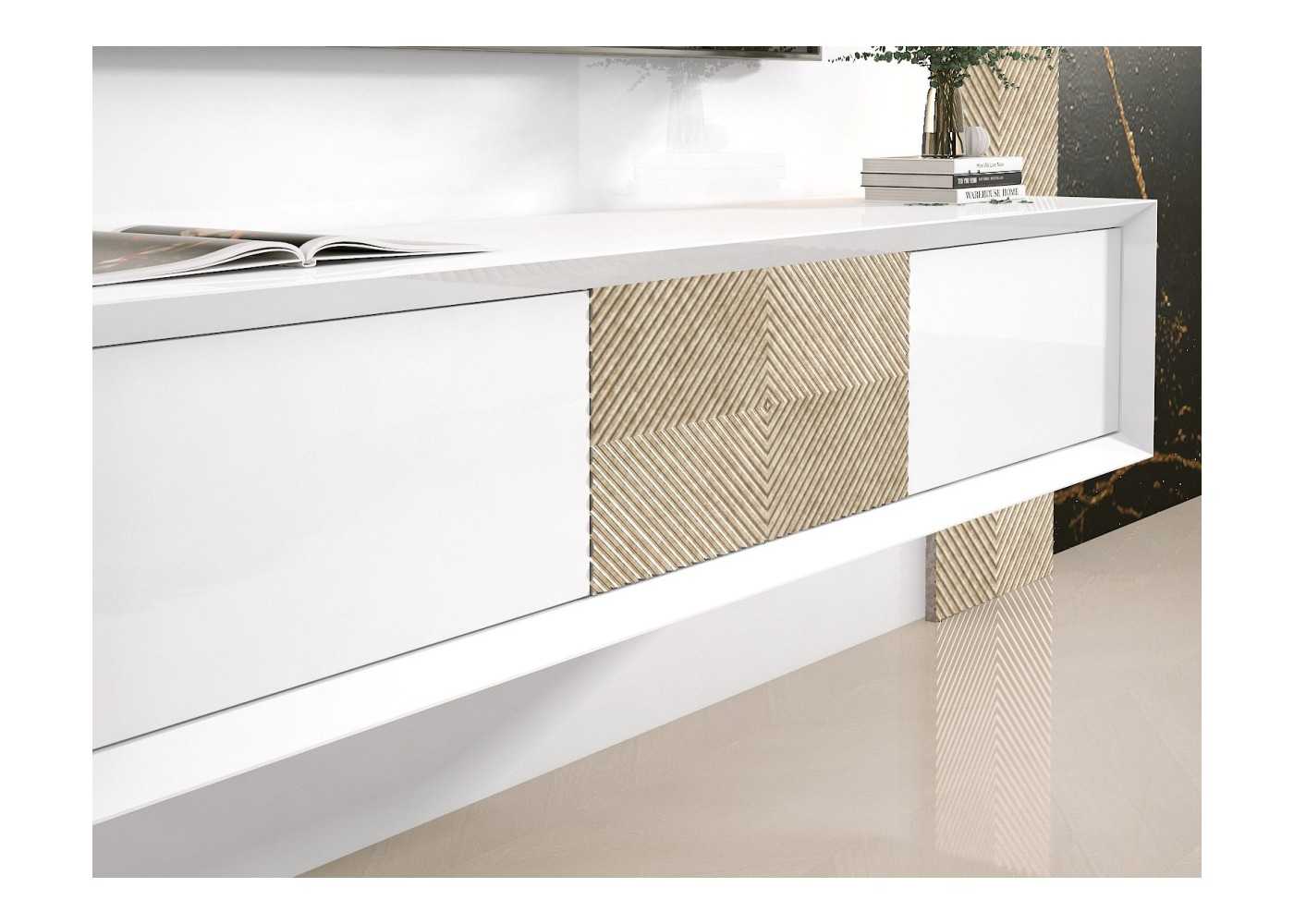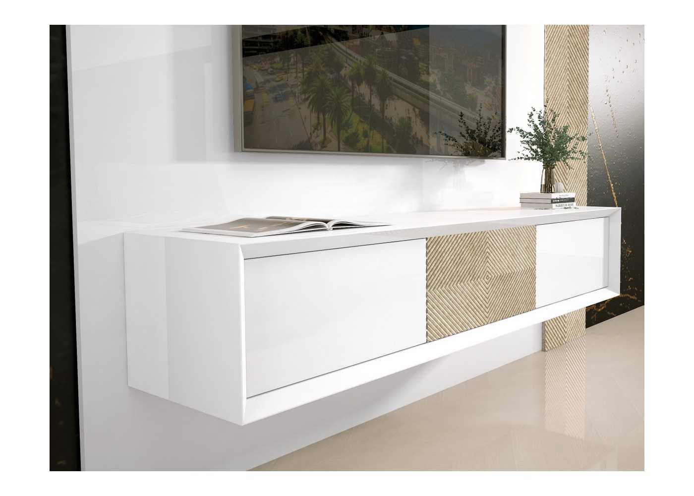 Composition au design moderne, spectaculaire et élégante, composée d'un meuble TV mural à trois tiroirs et d'un panneau arrière laqué orné d'une gravure verticale en losange