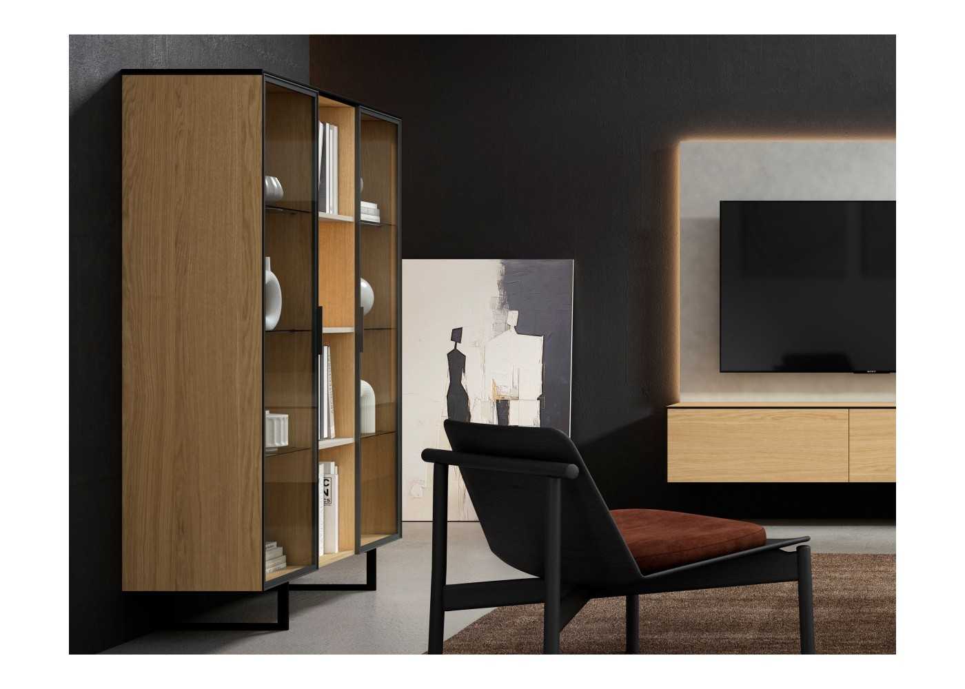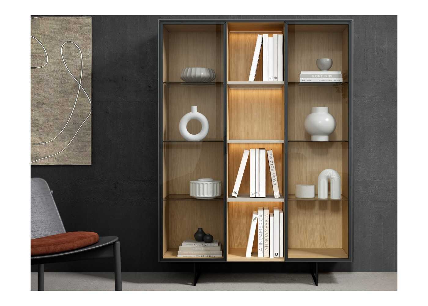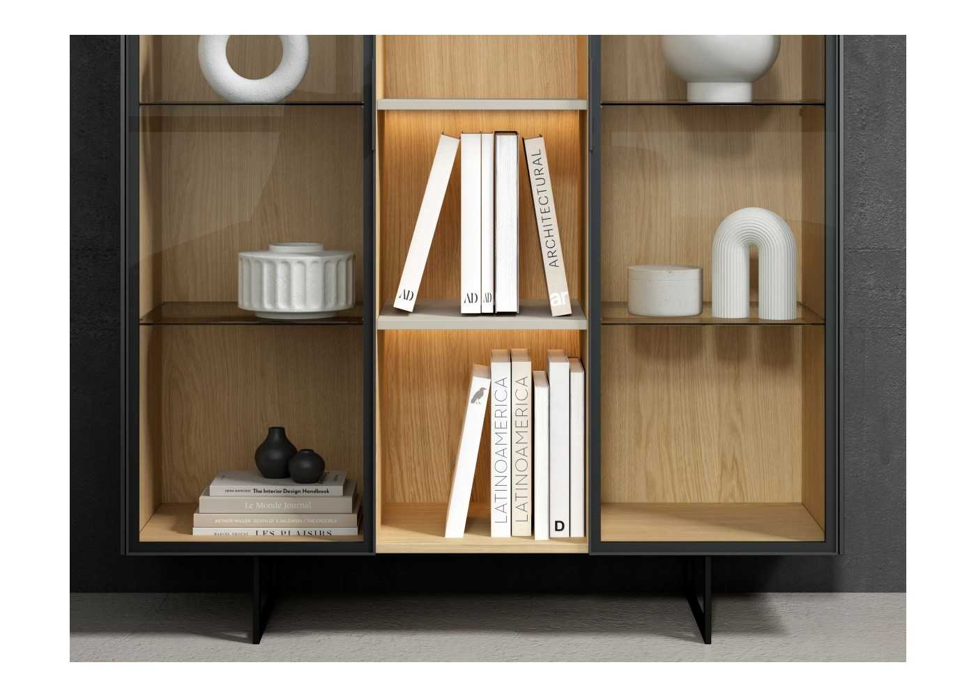 Élégante vitrine d'exposition en chêne naturel avec 2 portes en verre persol et espace central avec étagères laquées. Structure avec pieds en acier inoxydable laqués en noir.