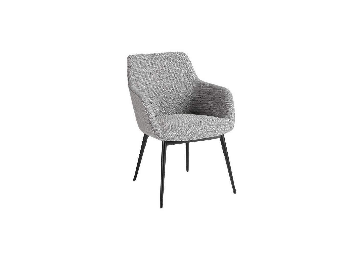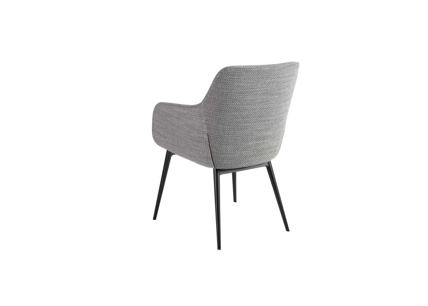 Chaise avec accoudoirs au design contemporain avec assise et dossier tapissé d'un tissu gris et pieds originaux en acier inoxydable époxy noir.