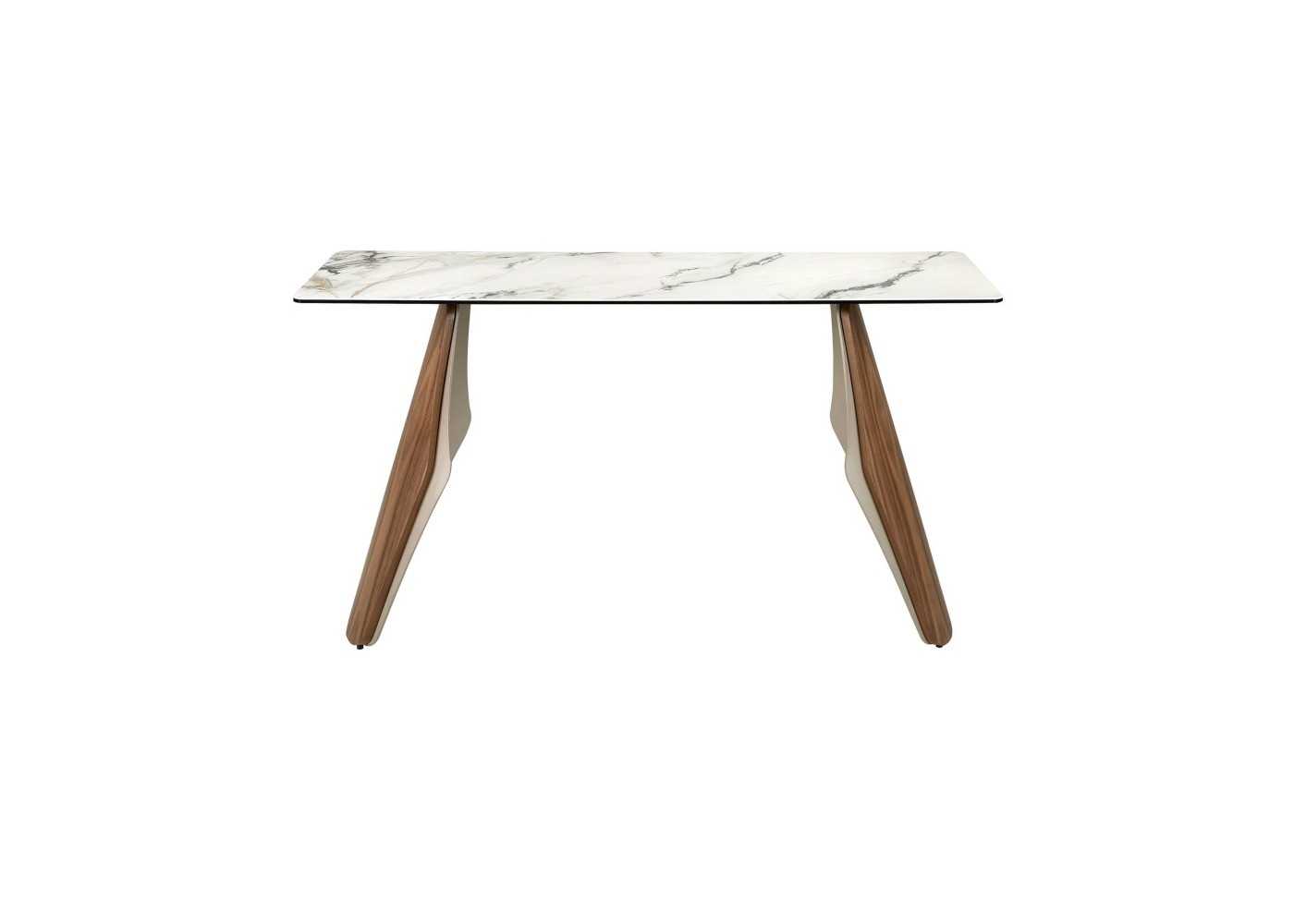 Console originale avec plateau rectangulaire en marbre de porcelaine blanc mat veiné de gris et de brun, et pieds de designer originaux avec extérieur en placage de noyer et intérieur en acier inoxydable laqué couleur sable métallisé.