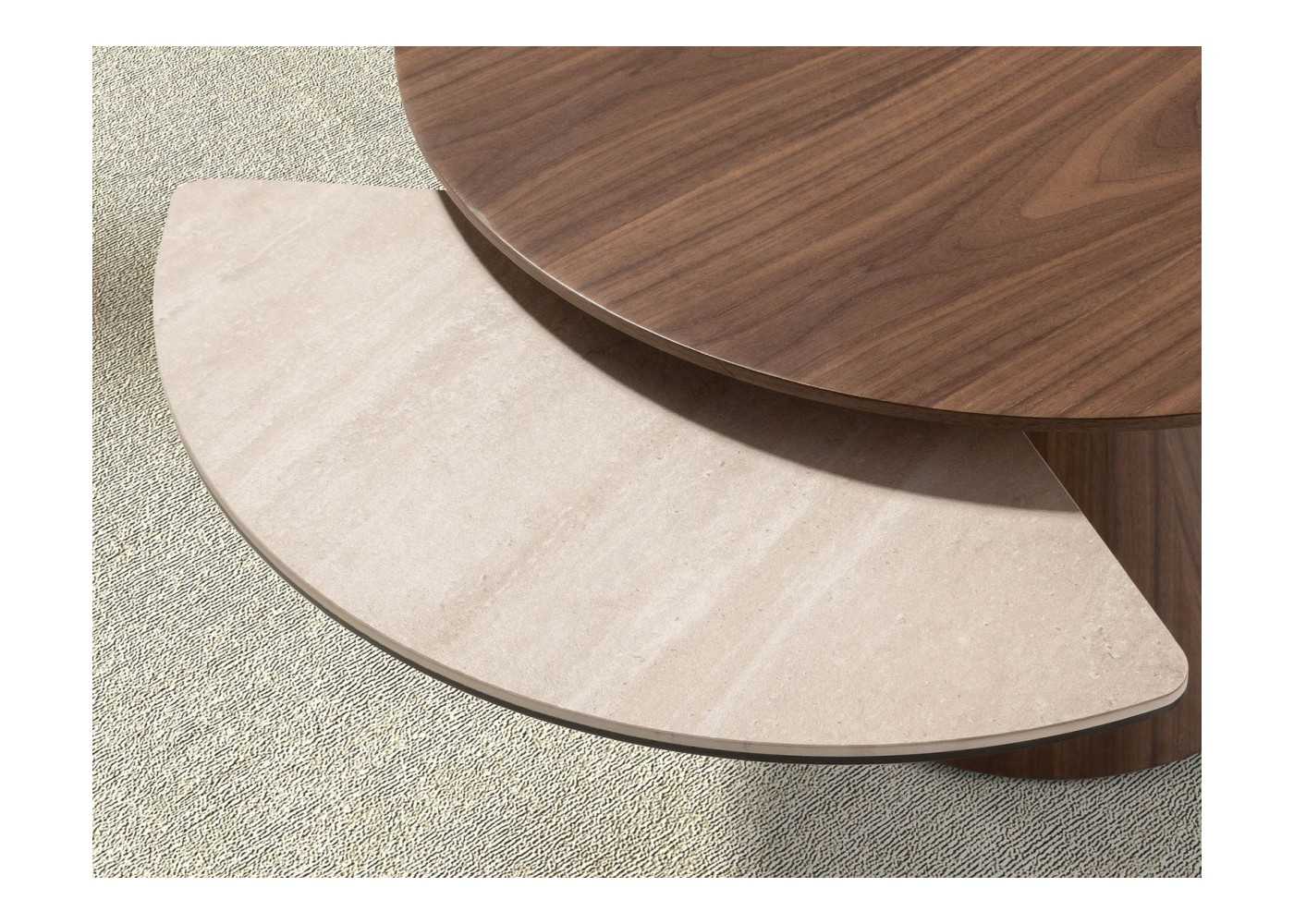 Table basse ronde originale en frêne plaqué noyer avec rallonges en marbre porcelaine couleur sable mat.