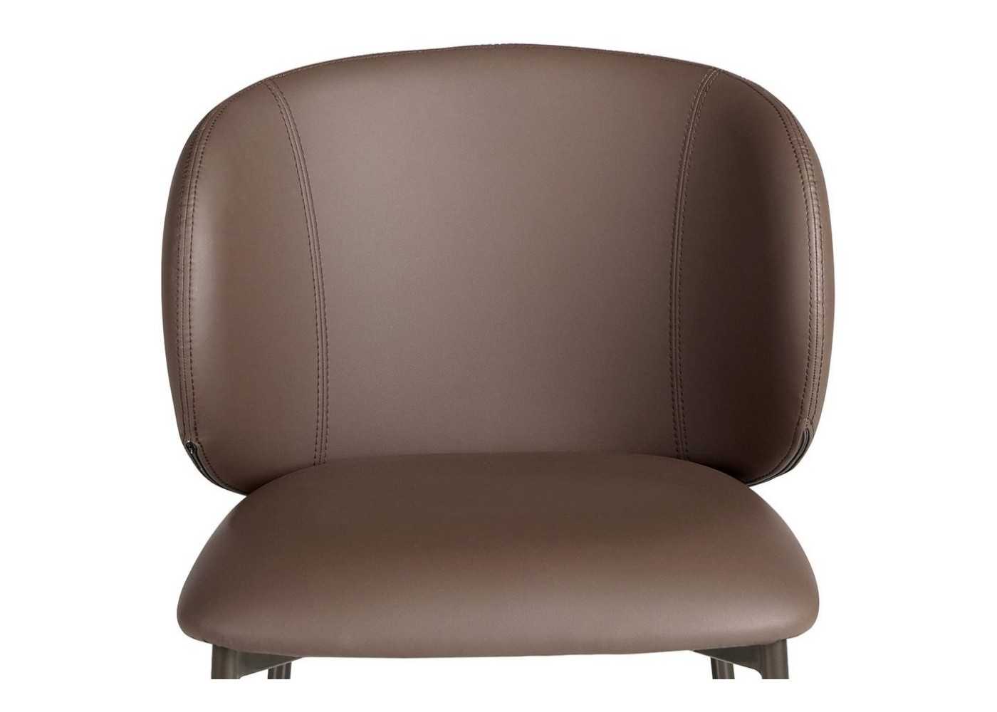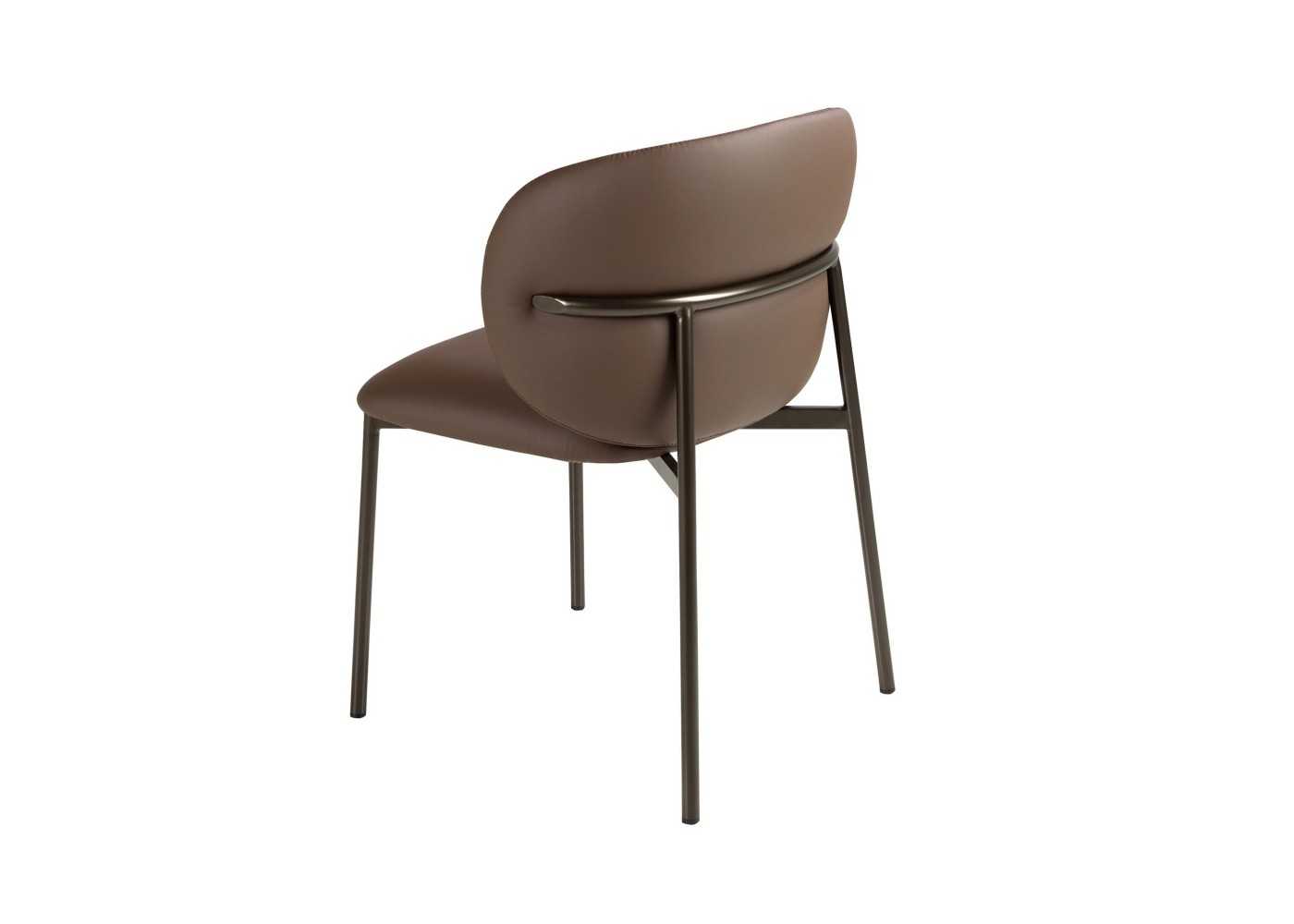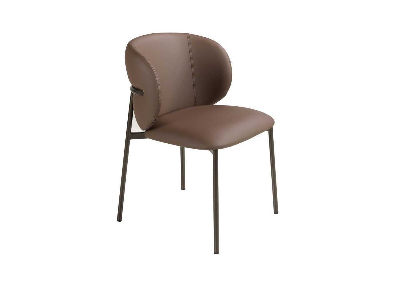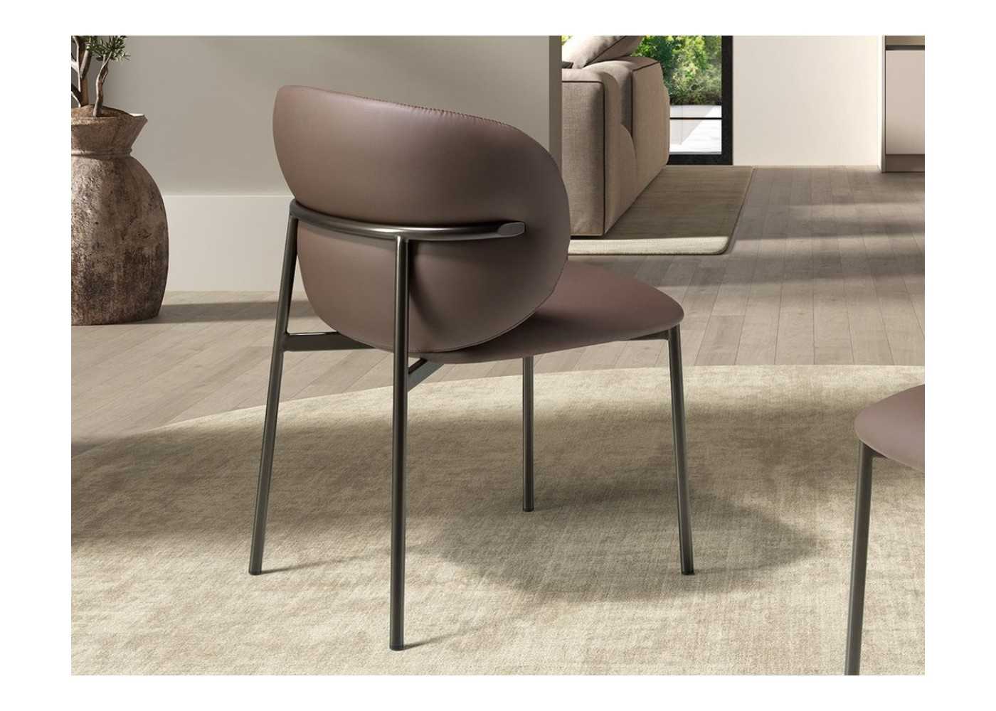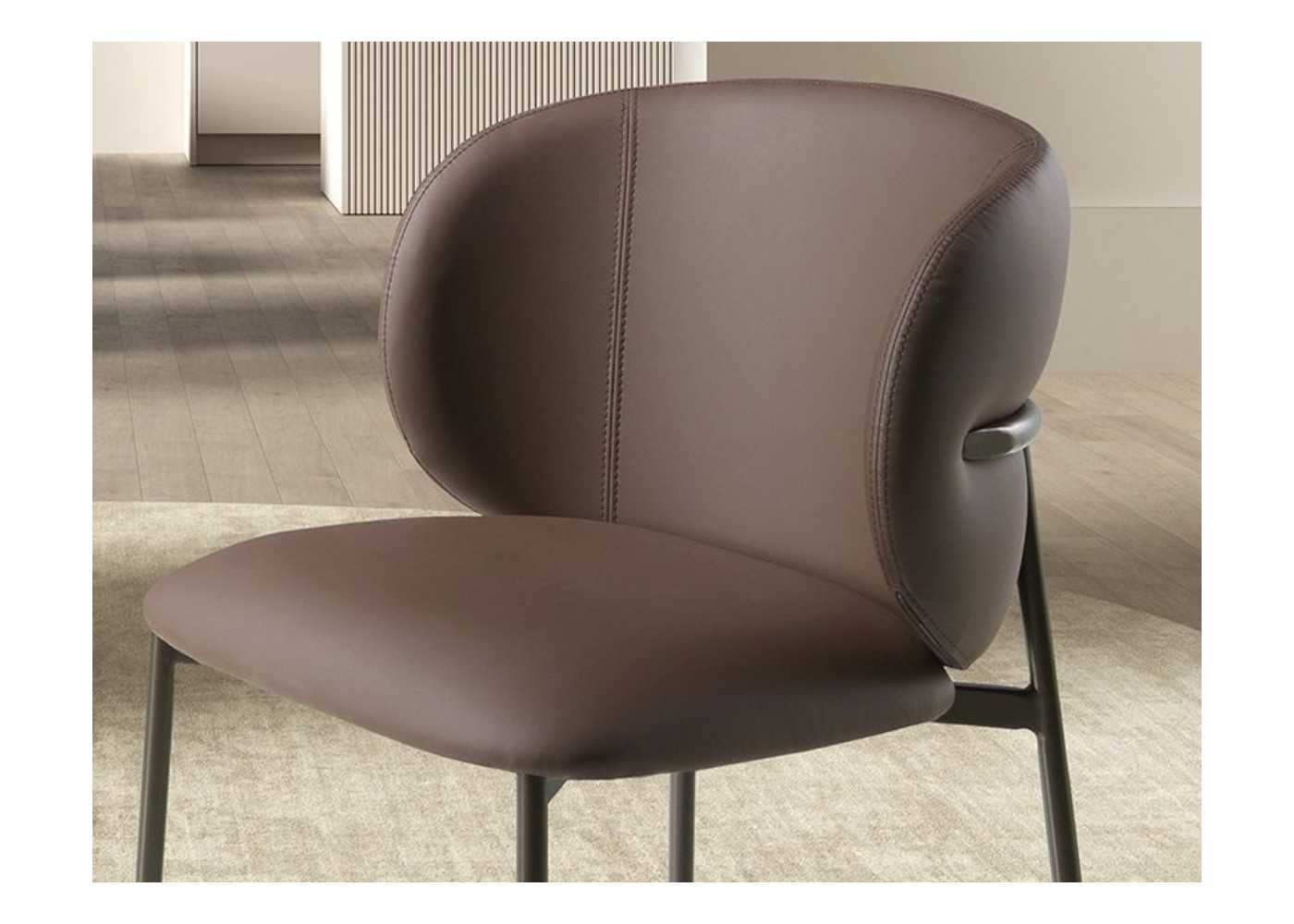 Chaise robuste, moderne et enveloppante, avec assise et dossier tapissé de similicuir marron foncé de haute qualité (90 % vinyle et 10 % polyester) et double couture artisanale.