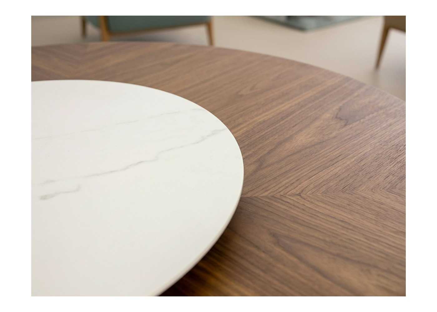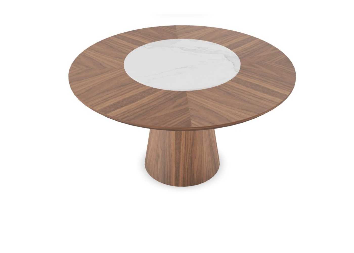 Table à manger ronde en noyer avec plateau tournant en marbre porcelaine blanc veiné gris.