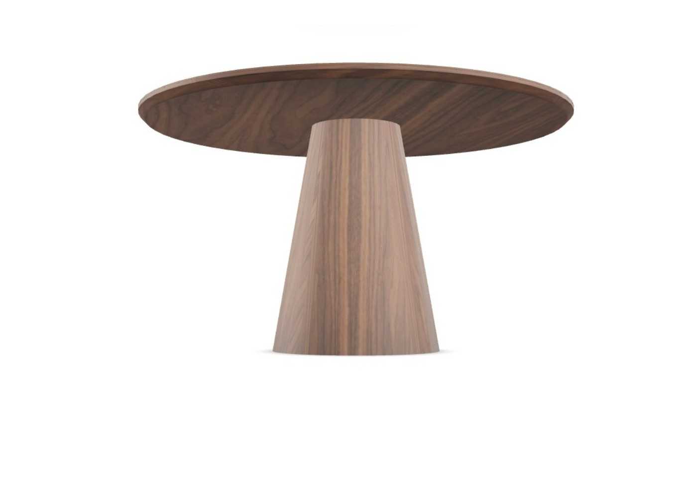 Table à manger ronde avec plateau fixe en bois plaqué noyer de 0,5 mm d'épaisseur.