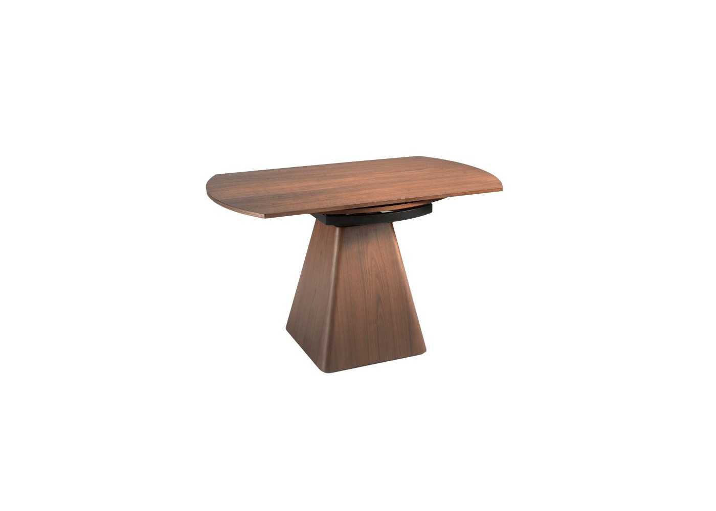 Table de salle à manger originale avec plateau rectangulaire en forme de tonneau convertible en plateau rond en bois plaqué noyer naturel.