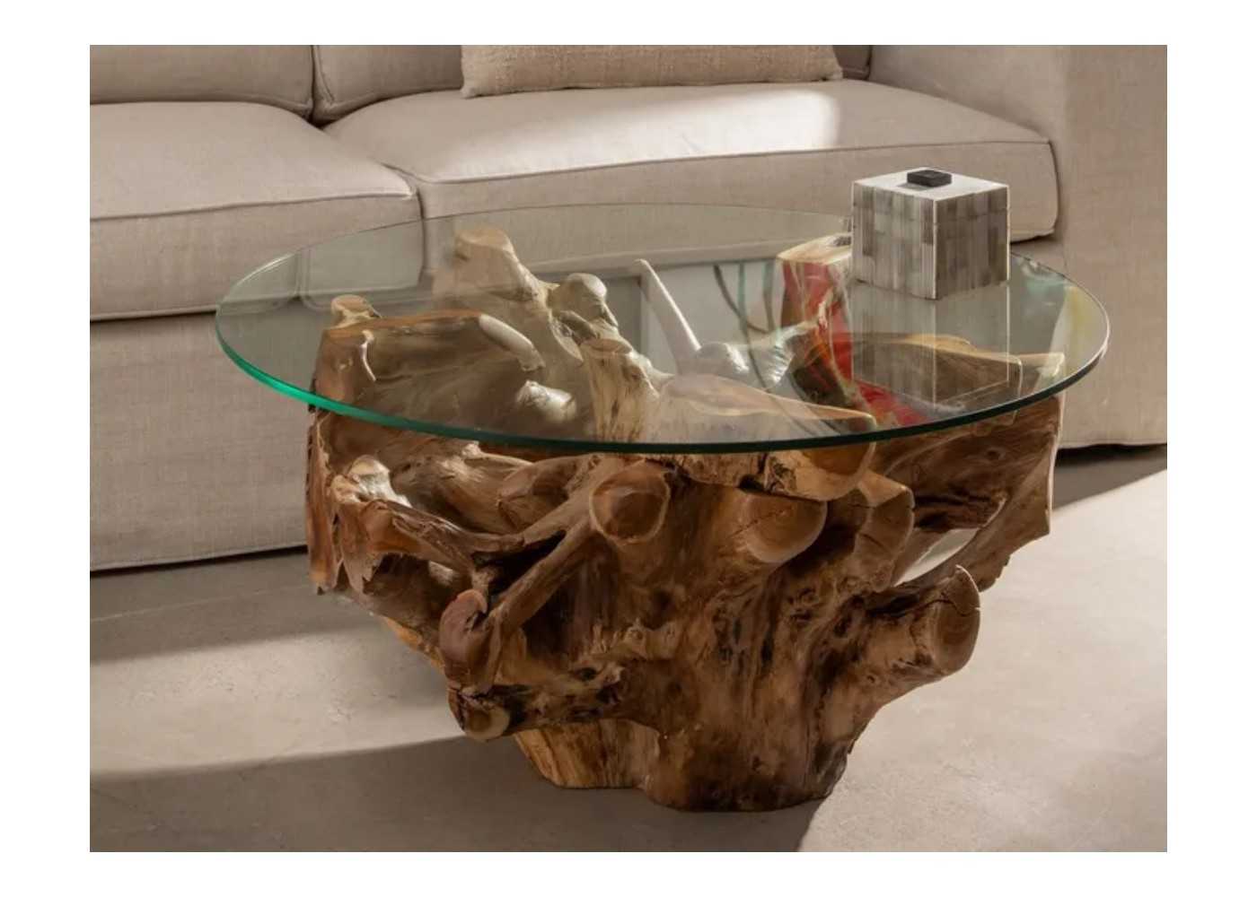 Table basse avec piètement en teck massif de couleur naturelle et plateau en verre trempé.