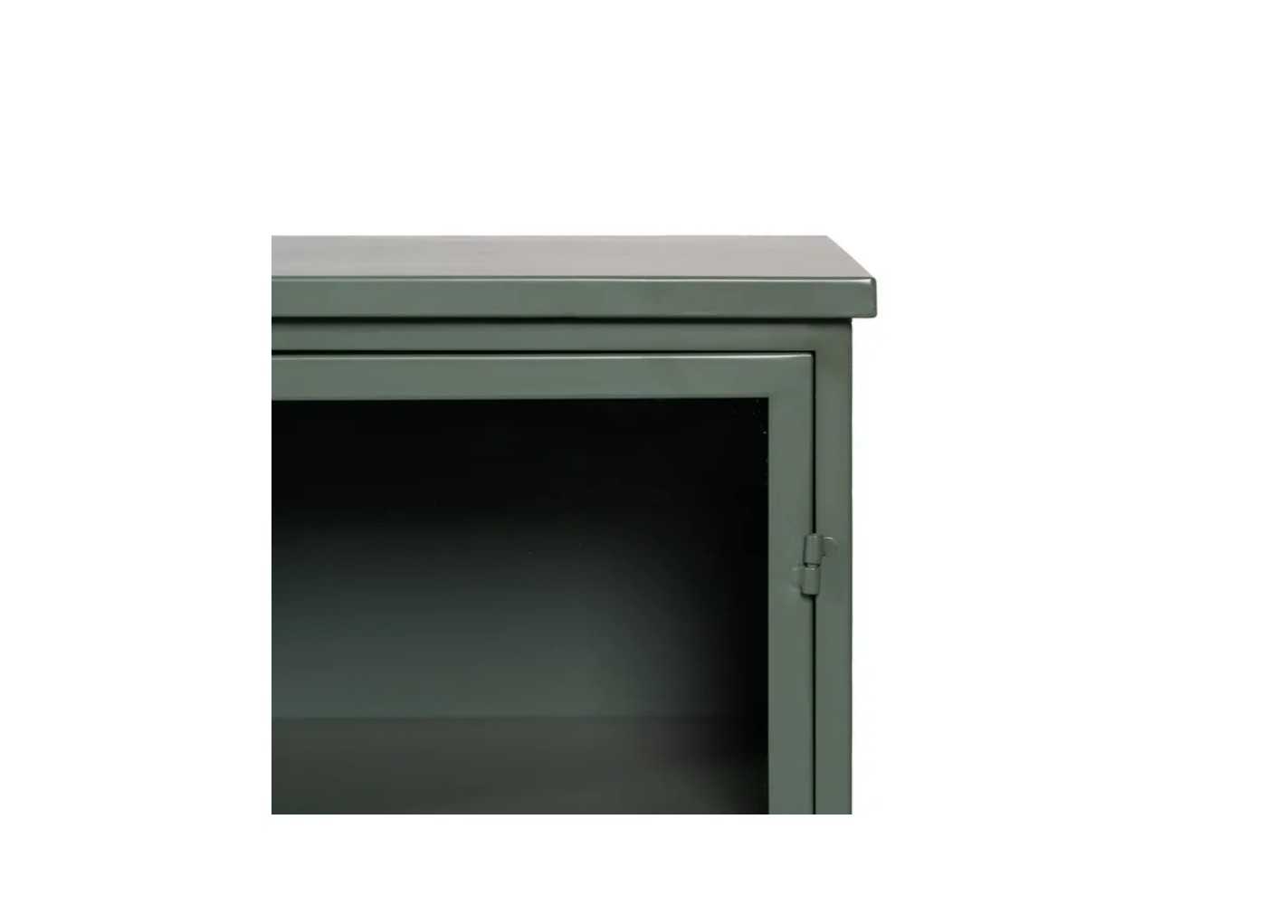 Vitrine de bureau au design rétro et industriel avec portes et vitres en fer laqué vert menthe.
