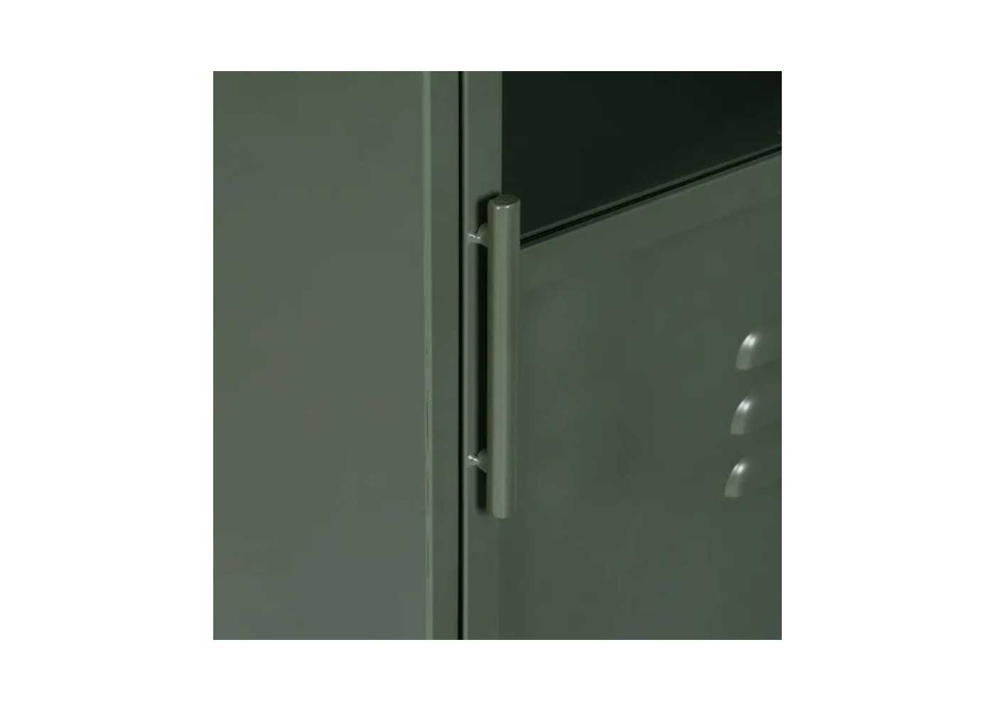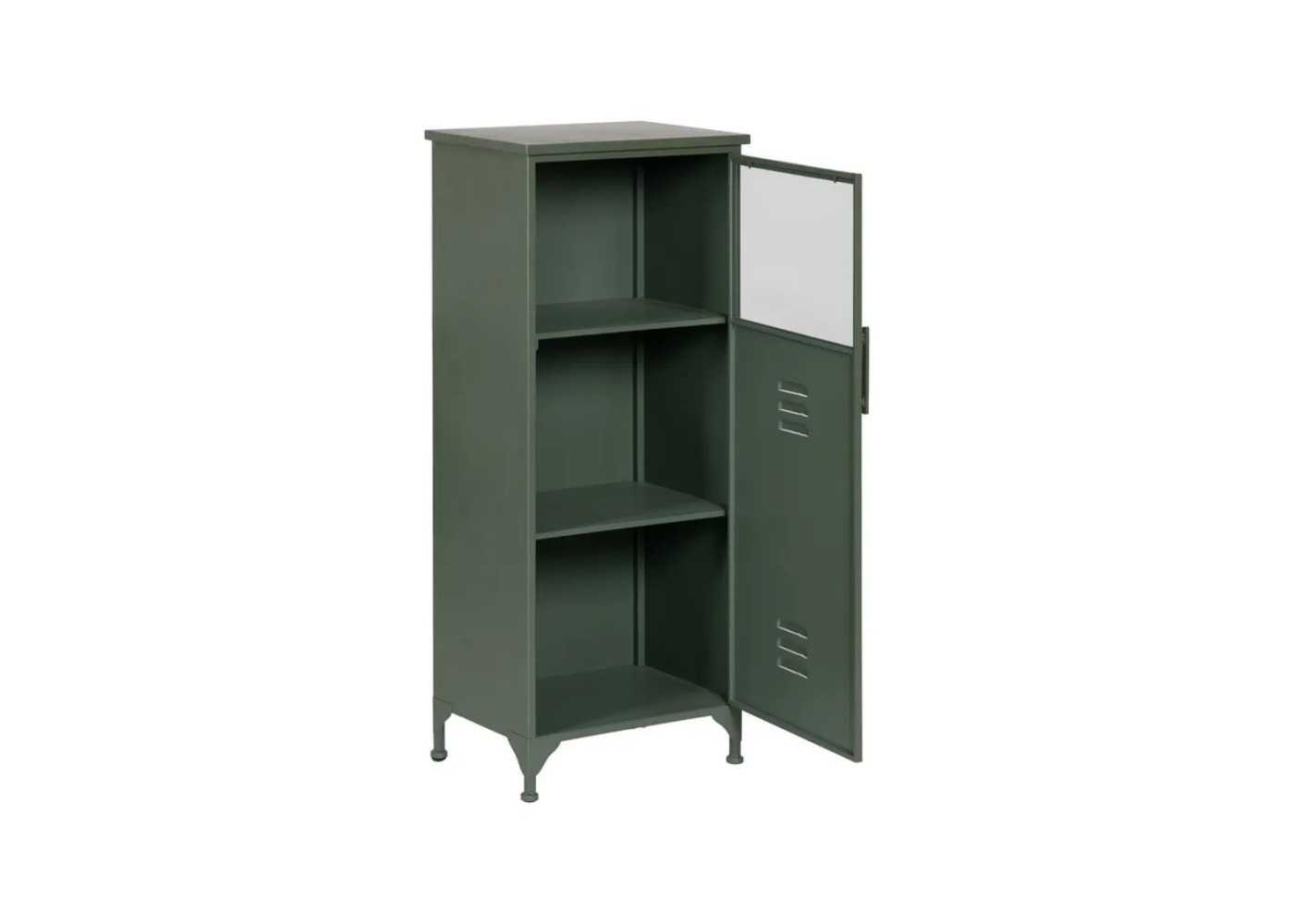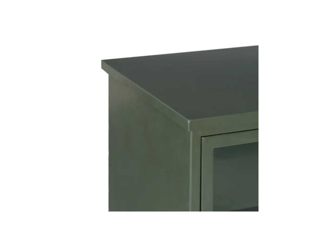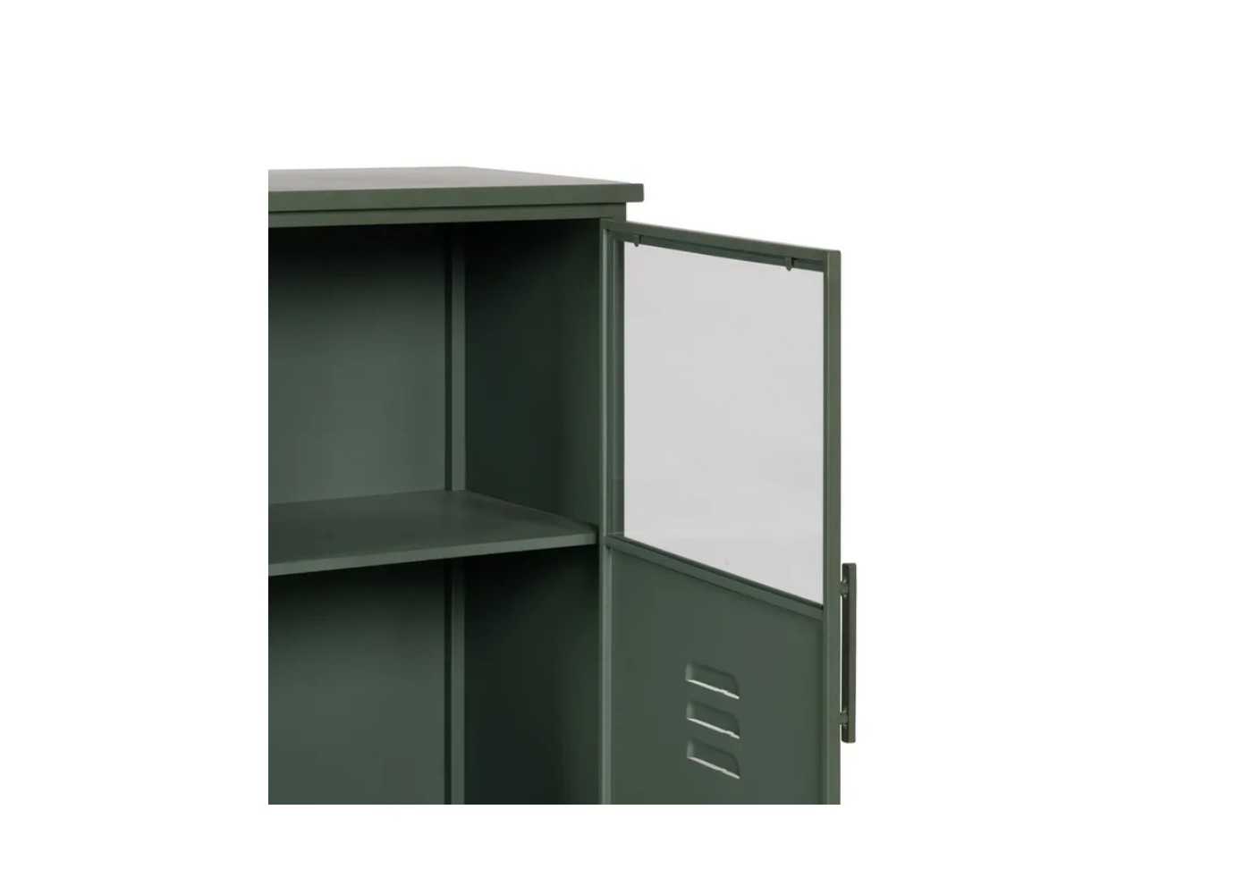 Meuble d'appoint, vitrine basse pour bureau au design rétro et industriel avec porte et vitre en fer laqué vert menthe.
