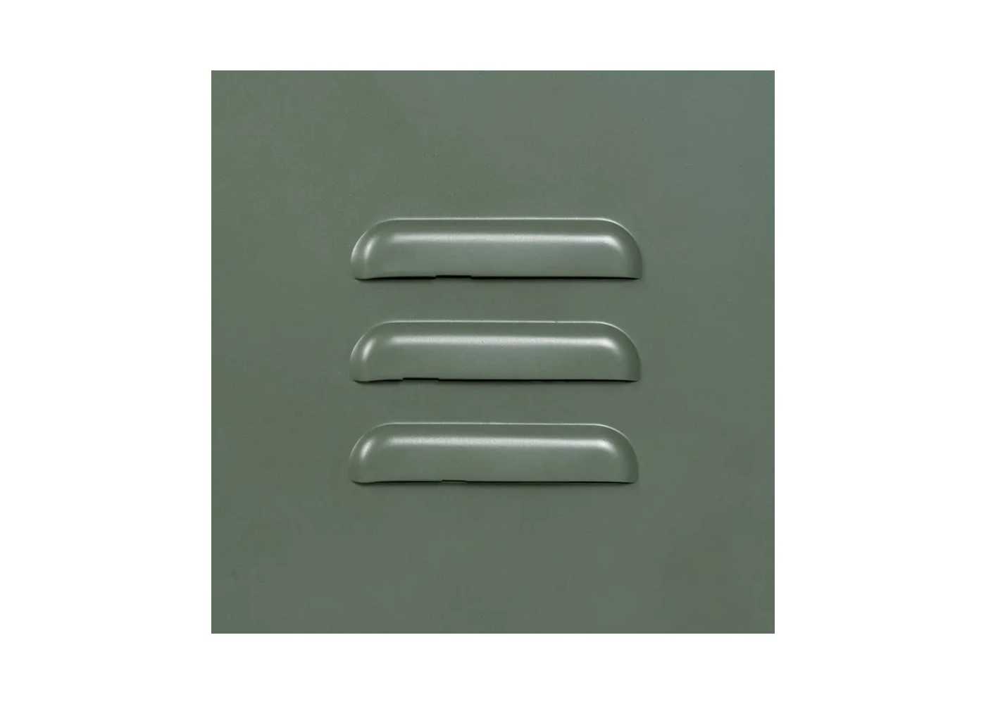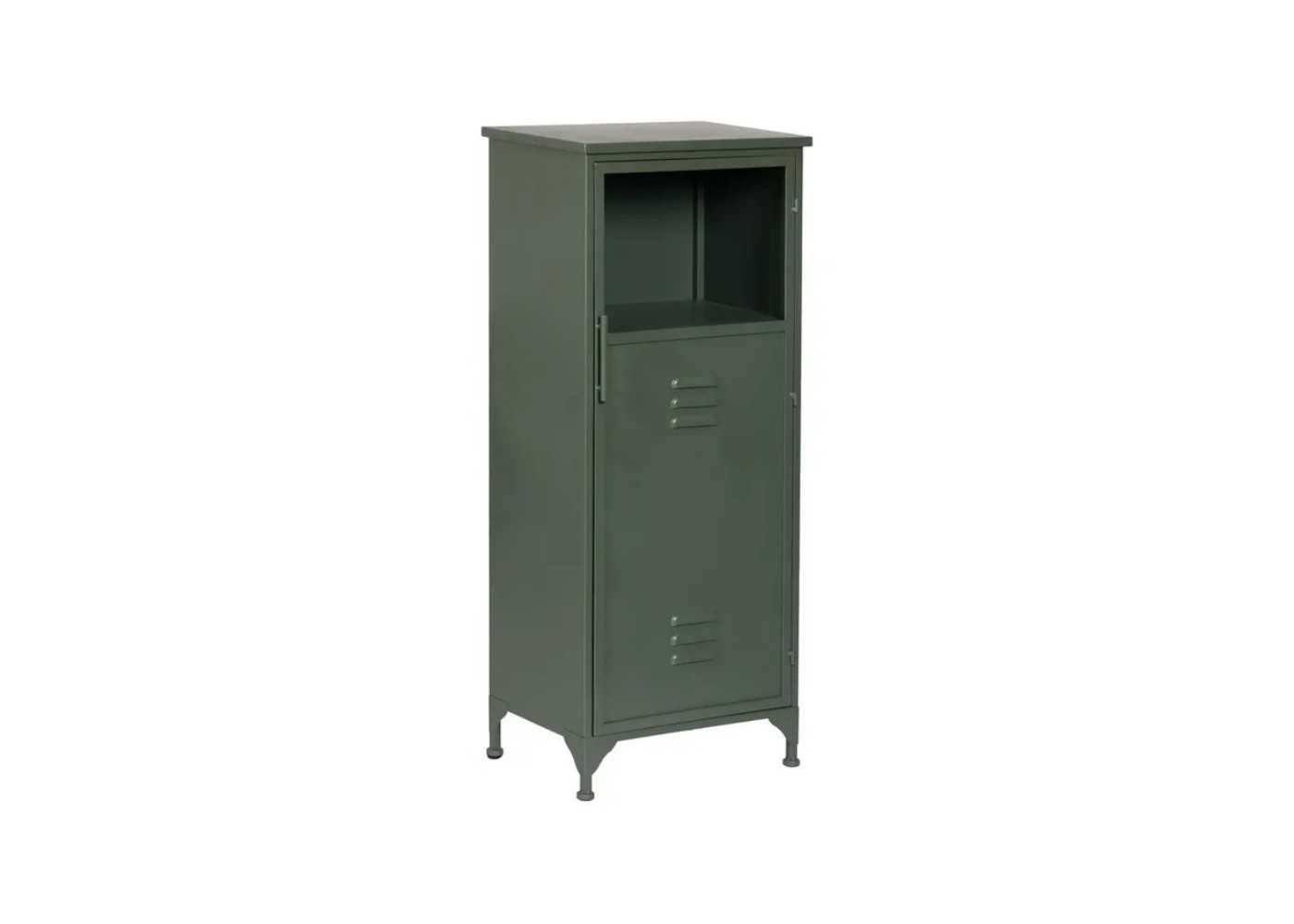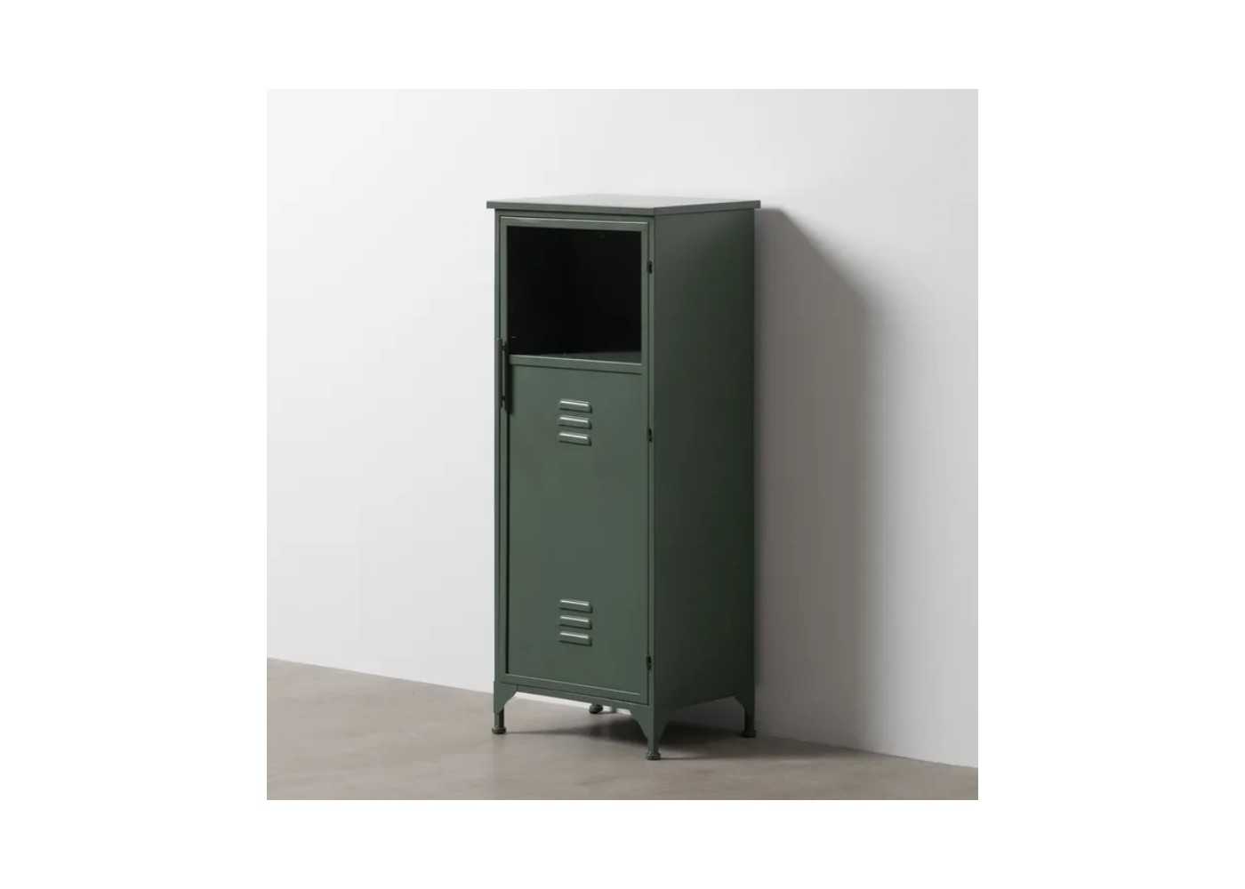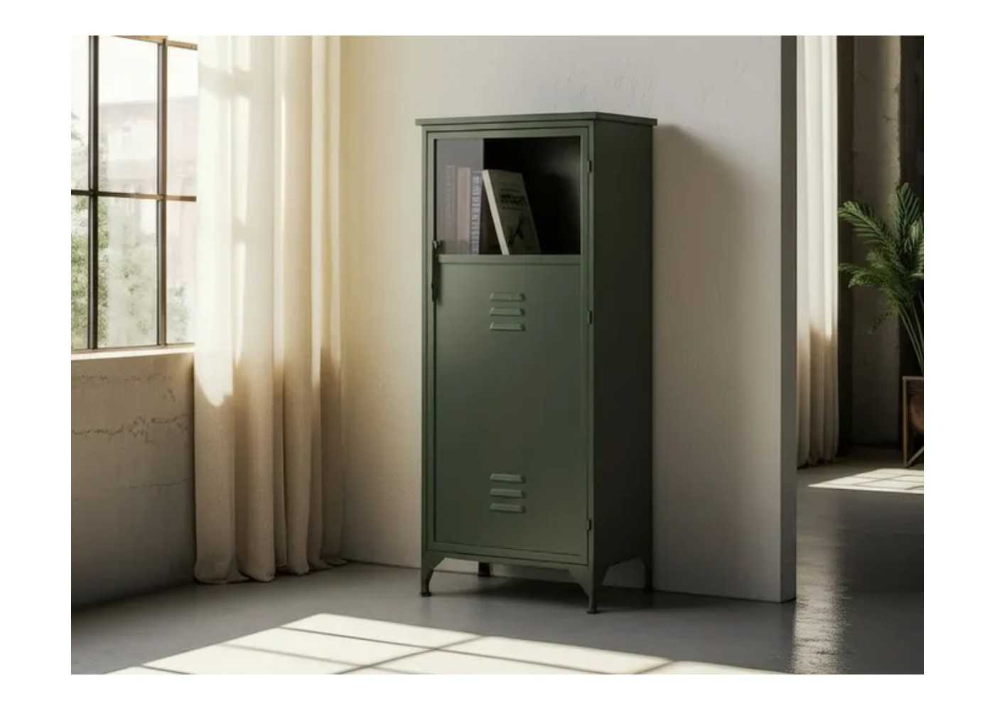 Meuble d'appoint, vitrine basse pour bureau au design rétro et industriel avec porte et vitre en fer laqué vert menthe.